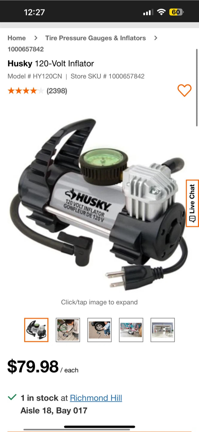 Selling a Husky 120-Volt Inflator that's in excellent condition! It's ideal for home, shop, and garage use. This inflator can inflate tires and sports equipment up to 130 PSI.