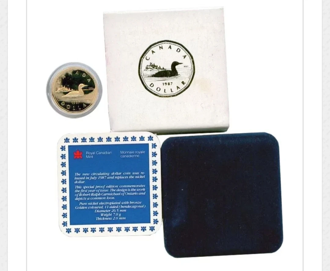 A proof striking of the loon dollar was issued by the Royal Canadian Mint in 1987 commemorating the first year of issue. The new circulating dollar coin was released in July 1987 and replaces the larger nickel dollar.