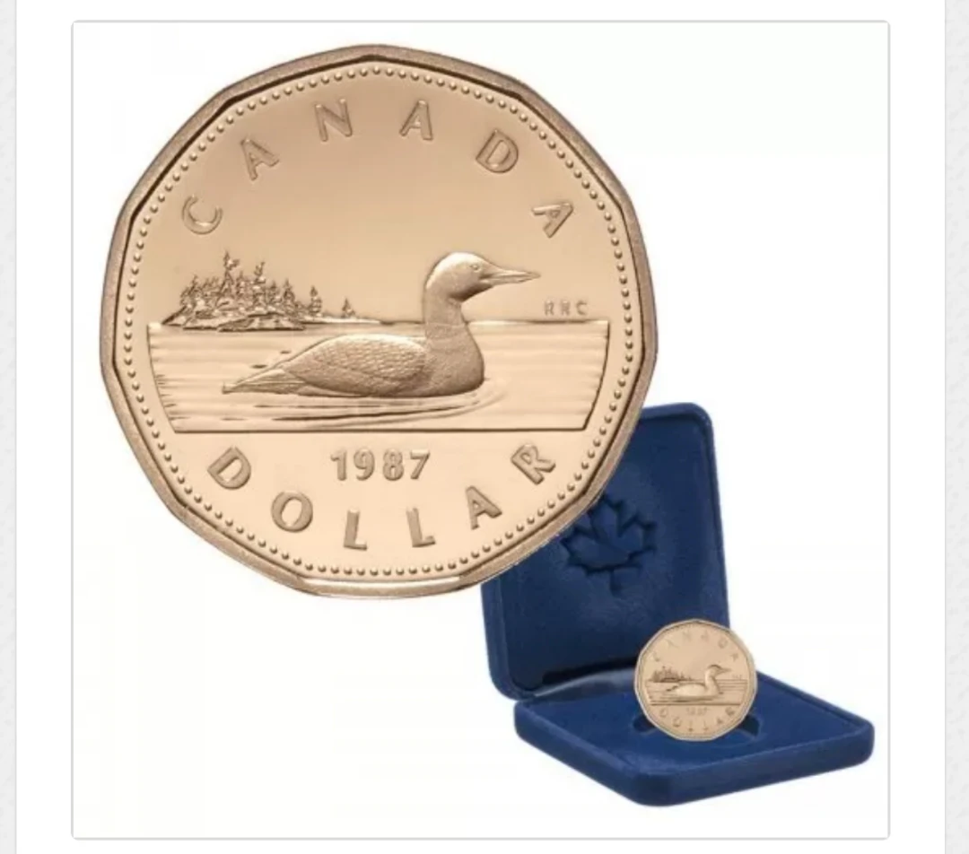 A proof striking of the loon dollar was issued by the Royal Canadian Mint in 1987 commemorating the first year of issue. The new circulating dollar coin was released in July 1987 and replaces the larger nickel dollar.