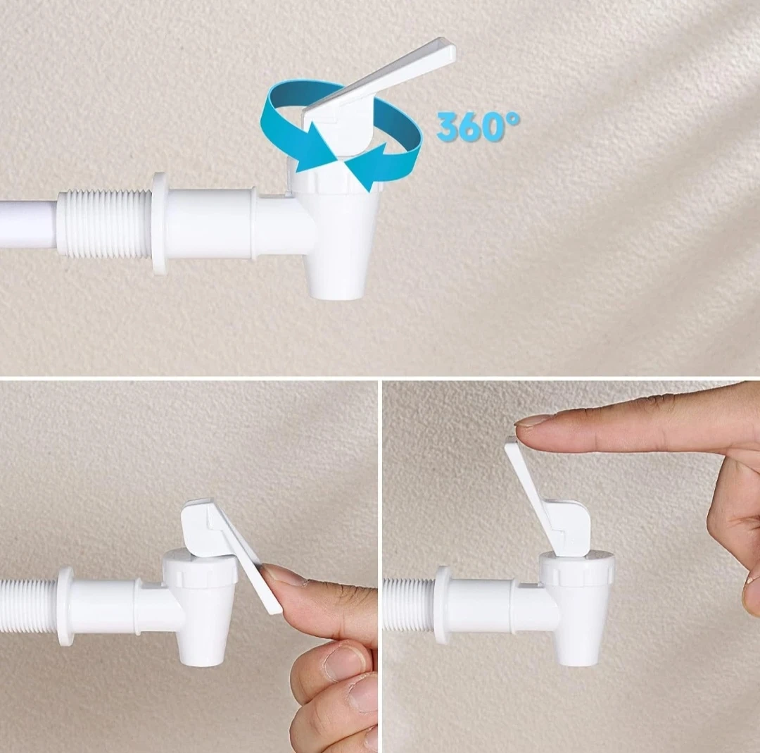 Replacement spigot for water dispensers. It's made of white plastic and features a 360-degree rotating handle. This spigot is easy to use for dispensing beverages.