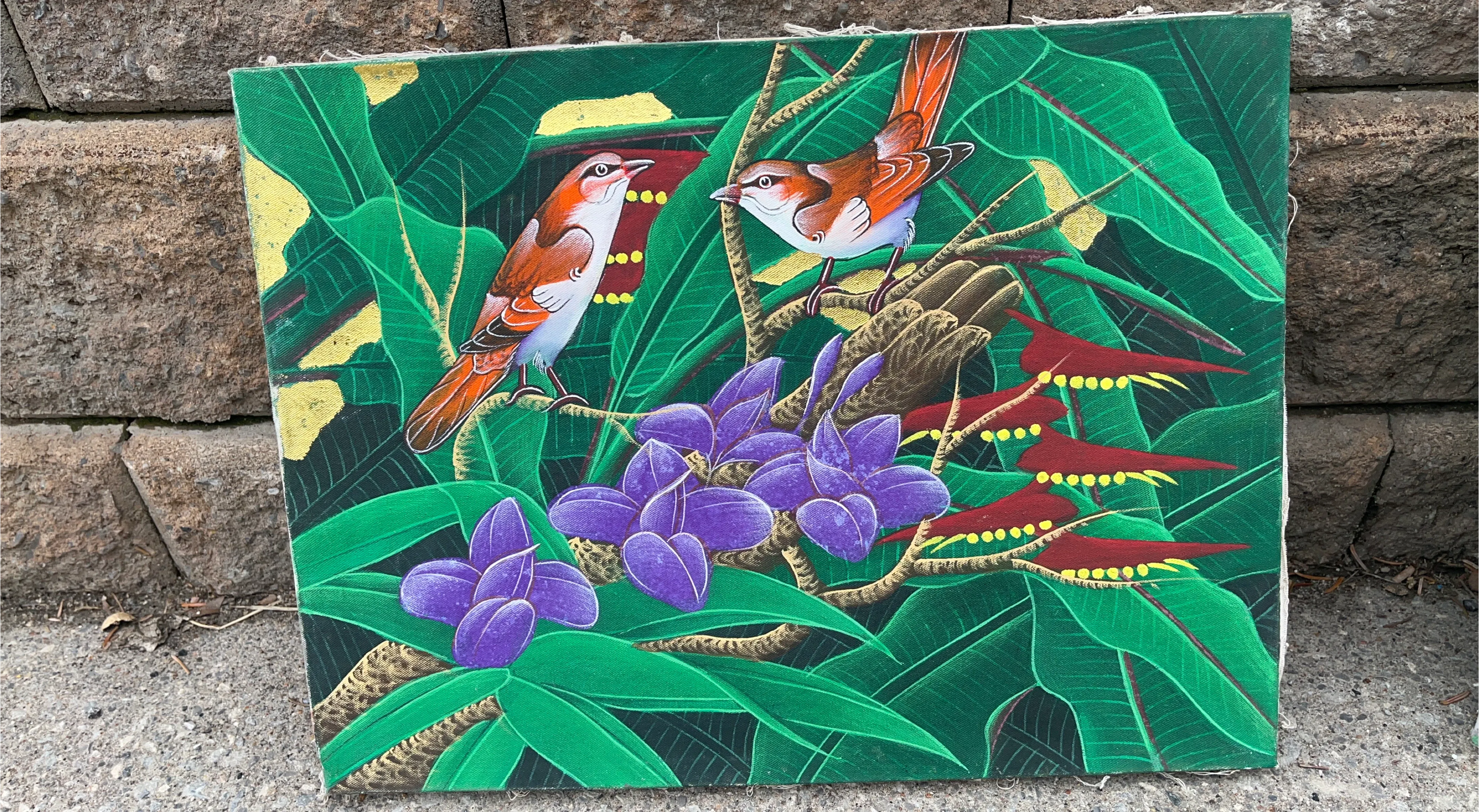 This painting depicts two orange and white birds perched among lush green leaves and purple flowers. Red and yellow accents add vibrancy to the tropical scene. It's painted on canvas with a natural fibre edge.