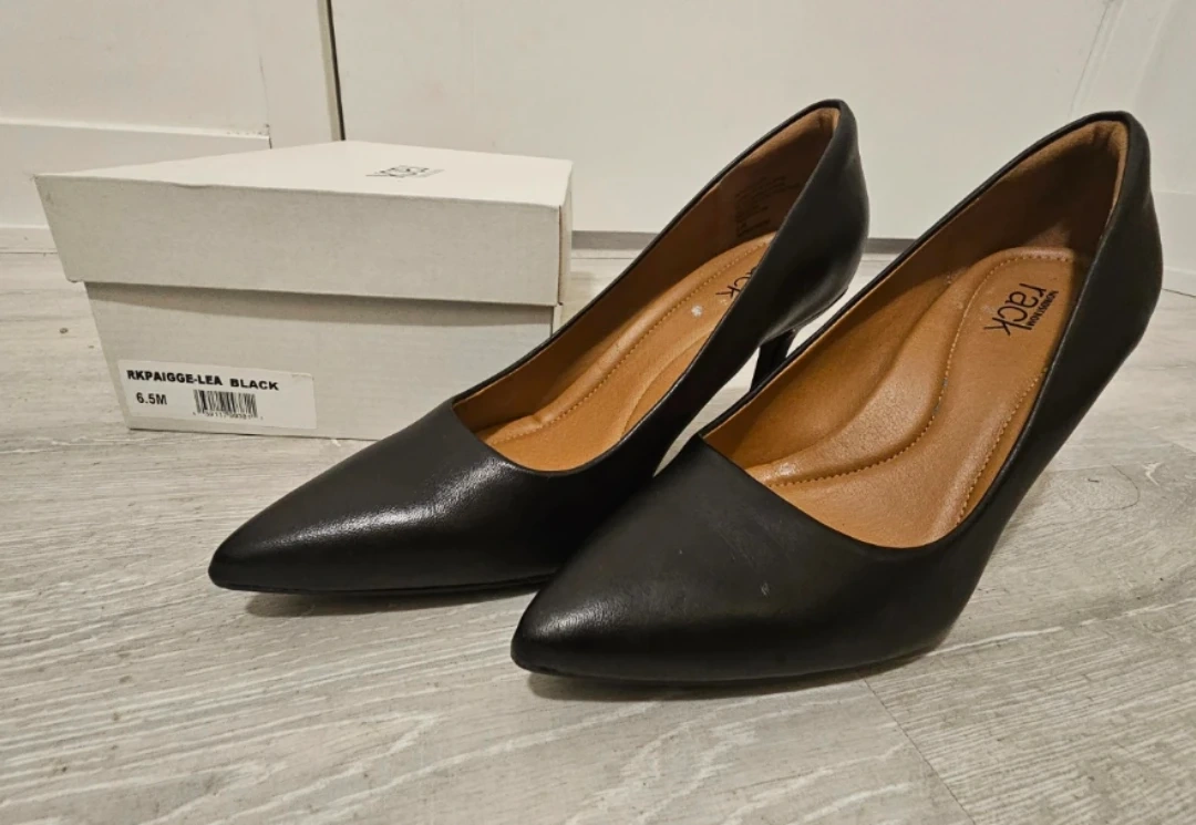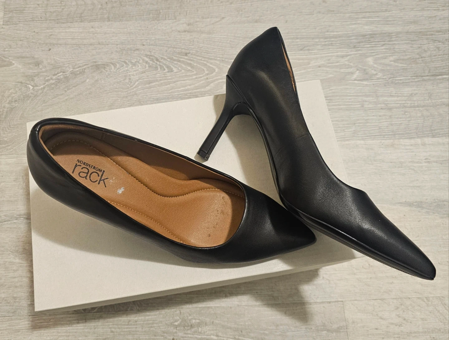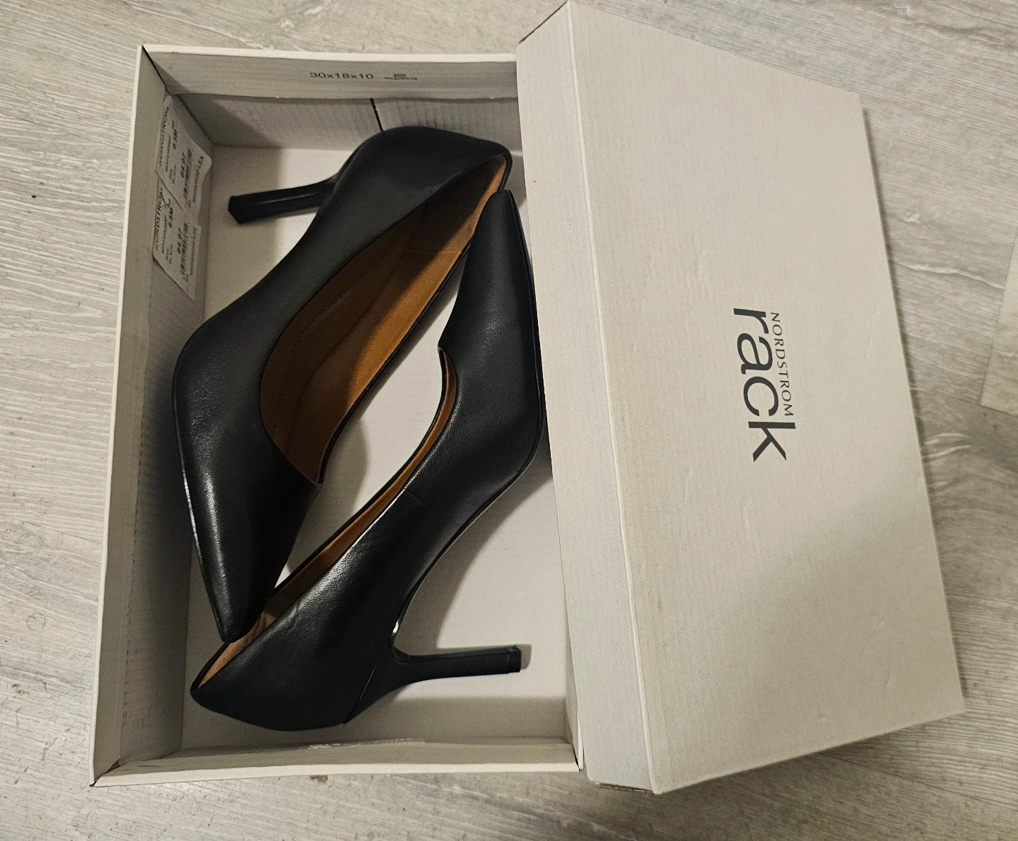 These black pointed toe heels from Nordstrom Rack are made of leather. They come in size 6.5 and include the original box.