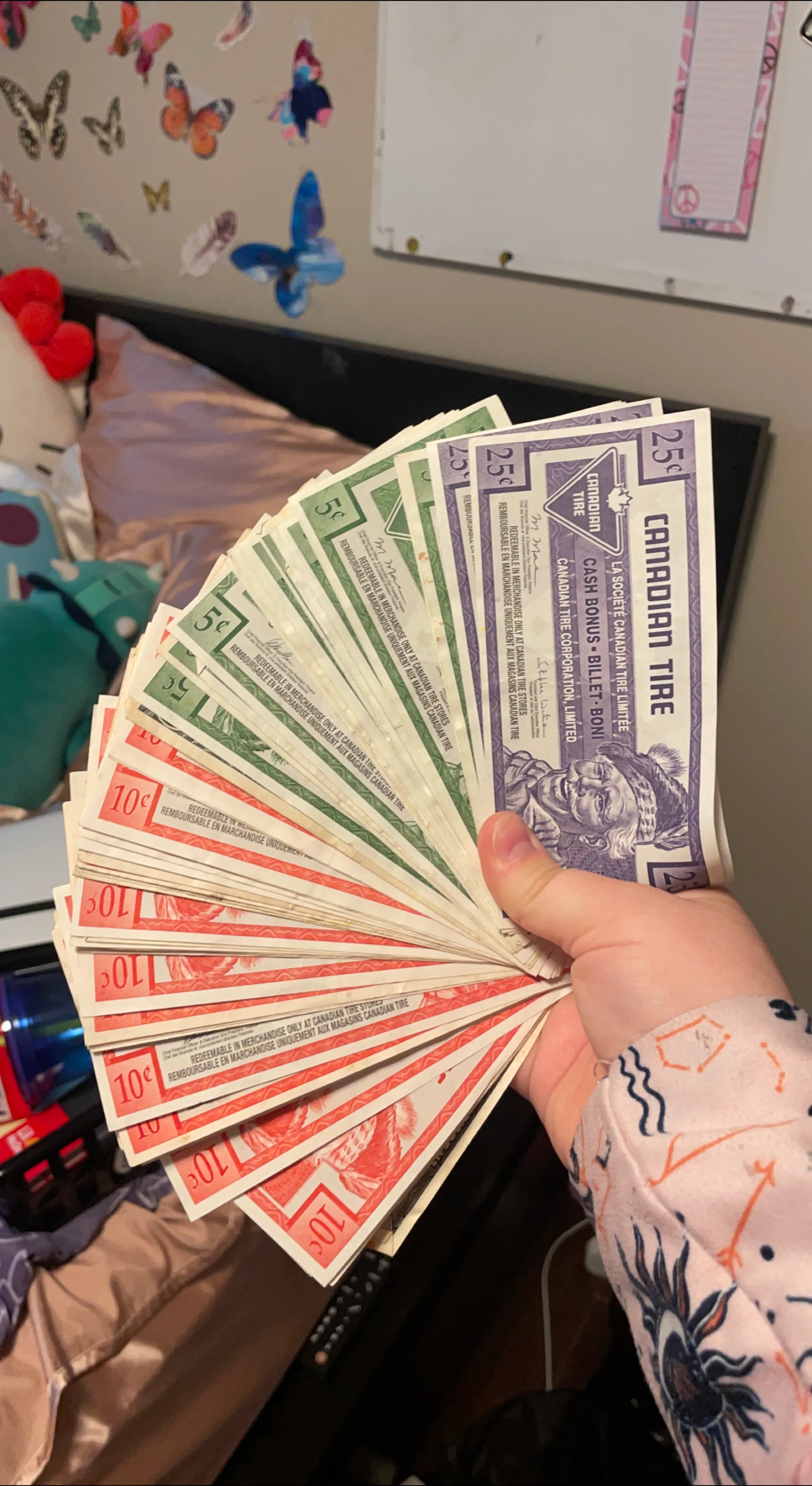 I have a collection of Canadian Tire money, including 5¢, 10¢, and 25¢ denominations. Perfect for your next Canadian Tire purchase!