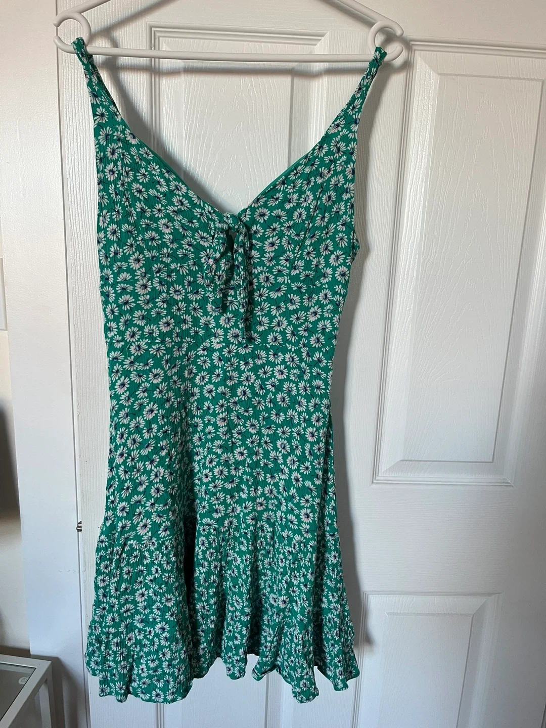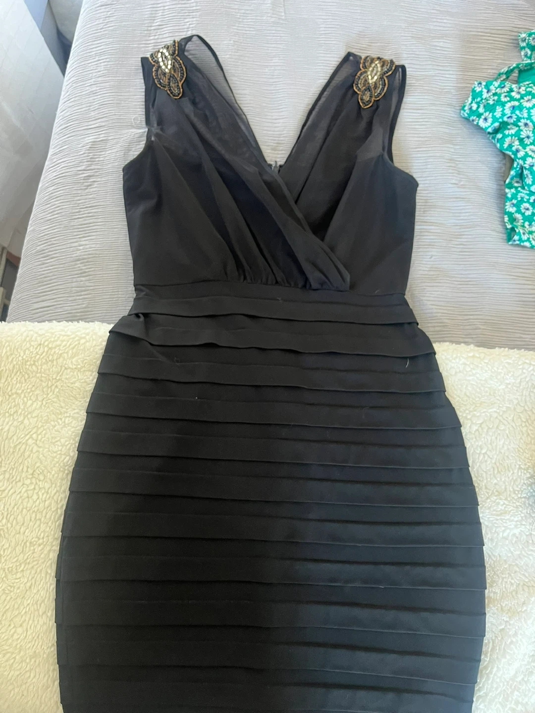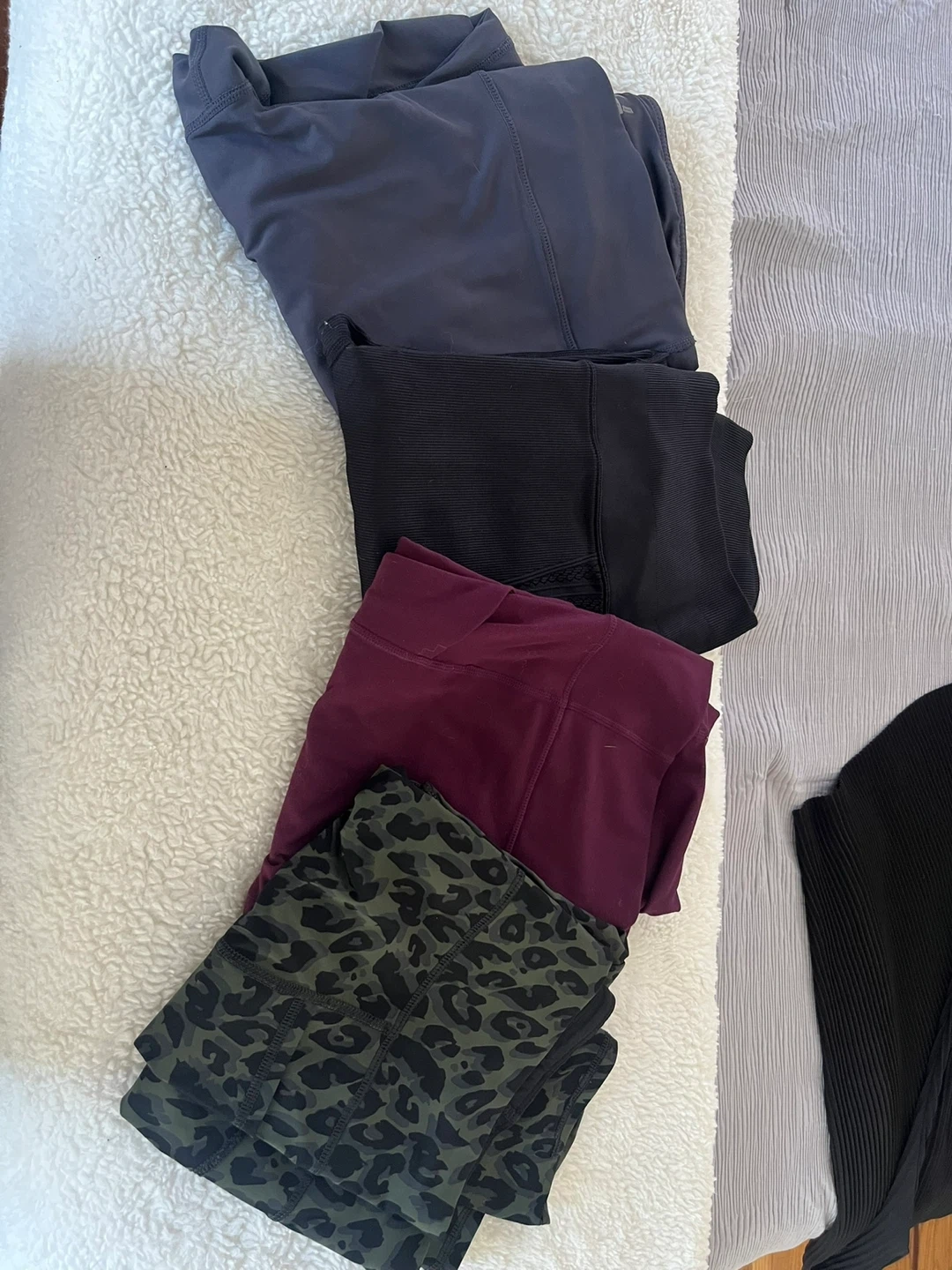 Selling a bundle of assorted clothing items! Included is a Loft dress with a maroon and black geometric pattern, a black dress with a twist front detail, a pair of jean shorts, a green floral dress, and a few pairs of leggings in various colors and patterns