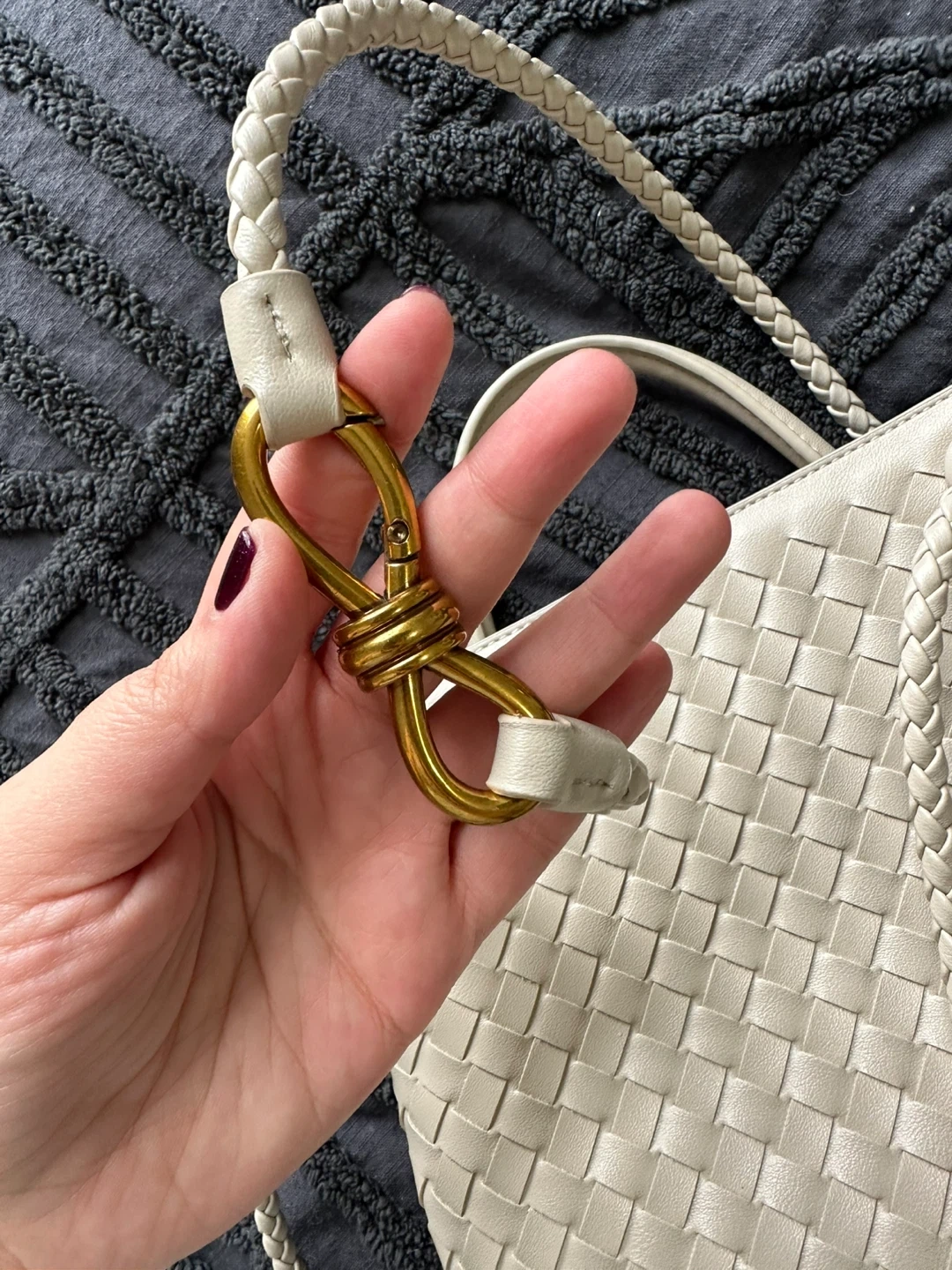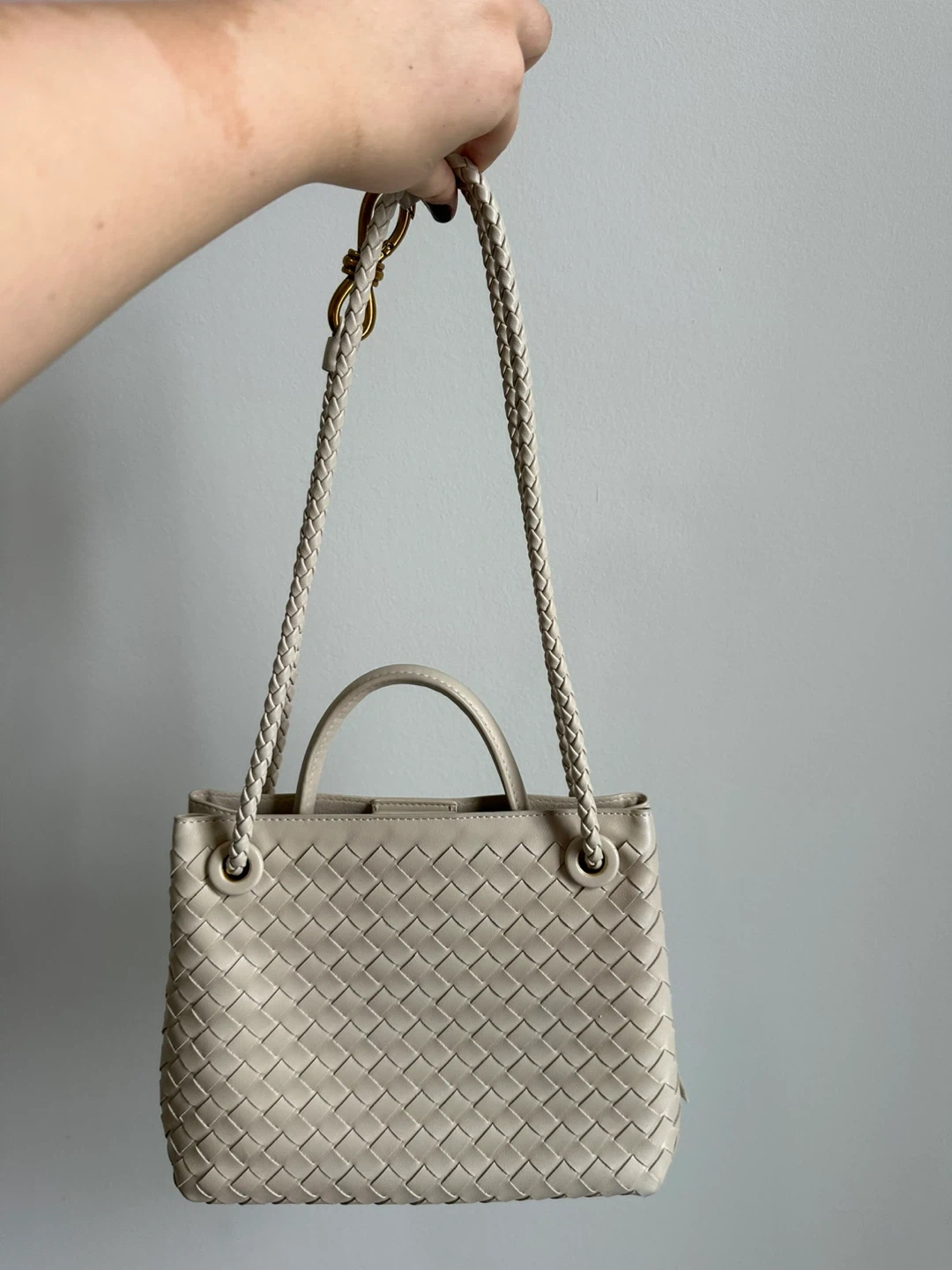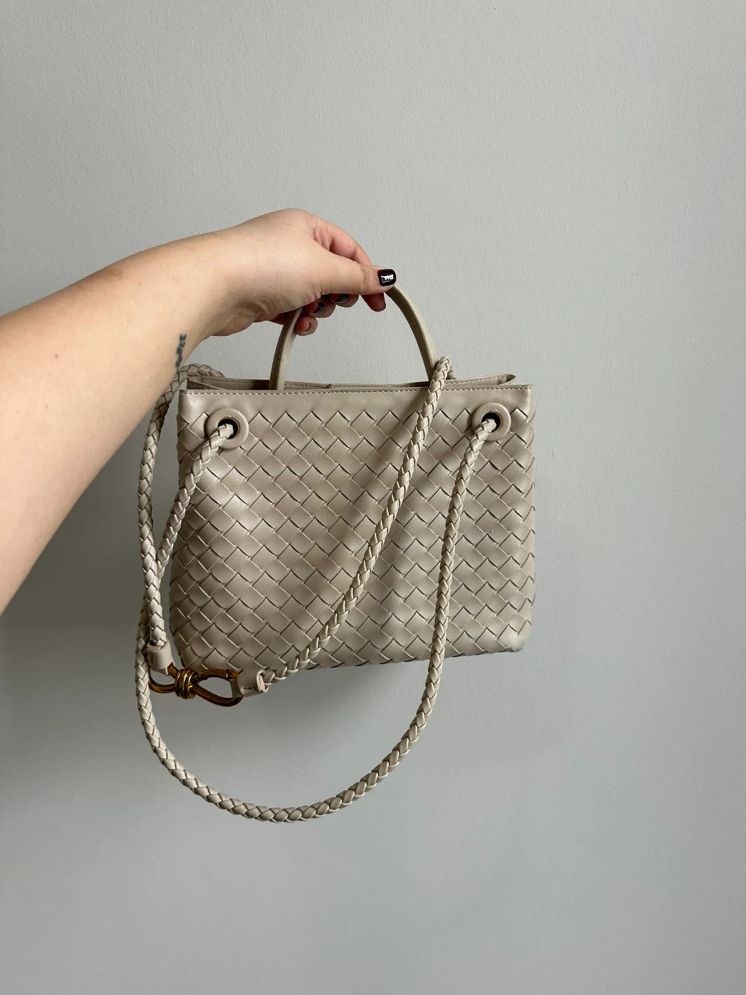 A chic white woven leather handbag with braided straps and gold hardware. It features a zippered interior pocket and a detachable crossbody strap. This bag is perfect for everyday use or for a night out!