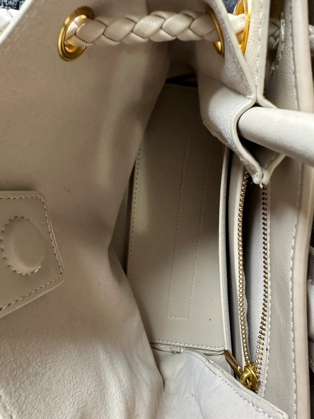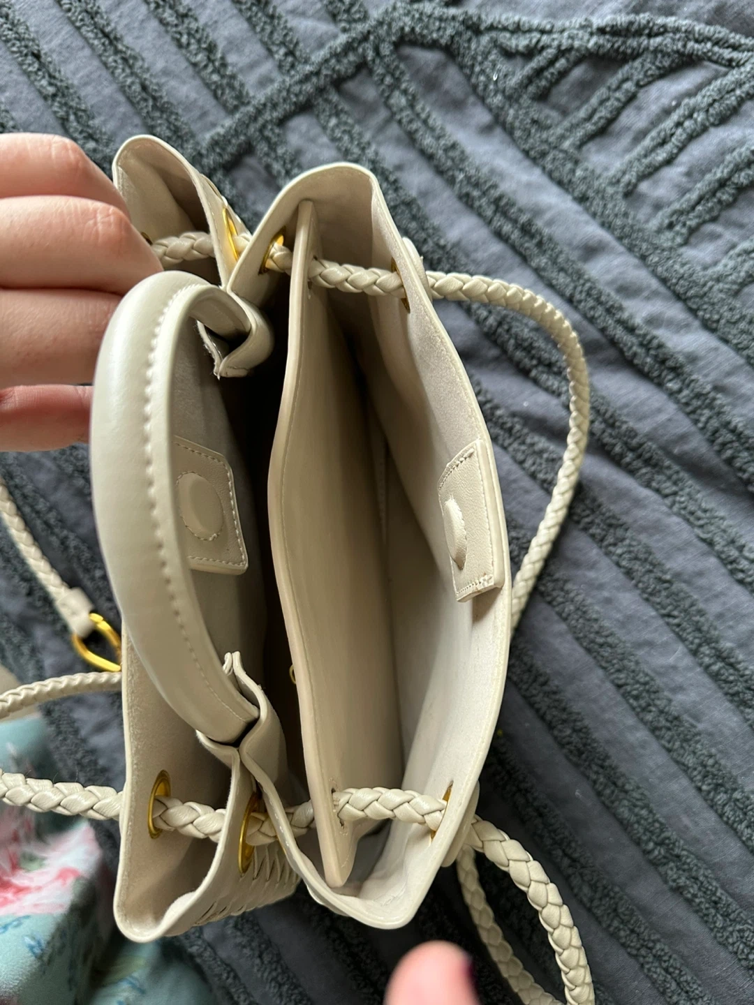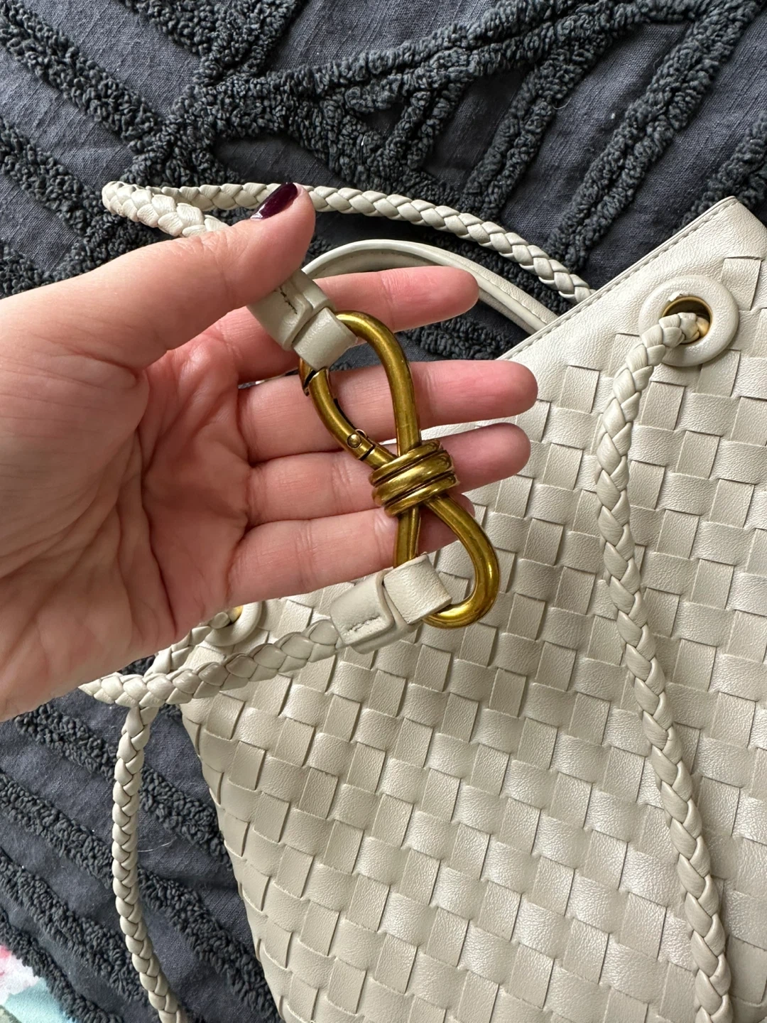 A chic white woven leather handbag with braided straps and gold hardware. It features a zippered interior pocket and a detachable crossbody strap. This bag is perfect for everyday use or for a night out!