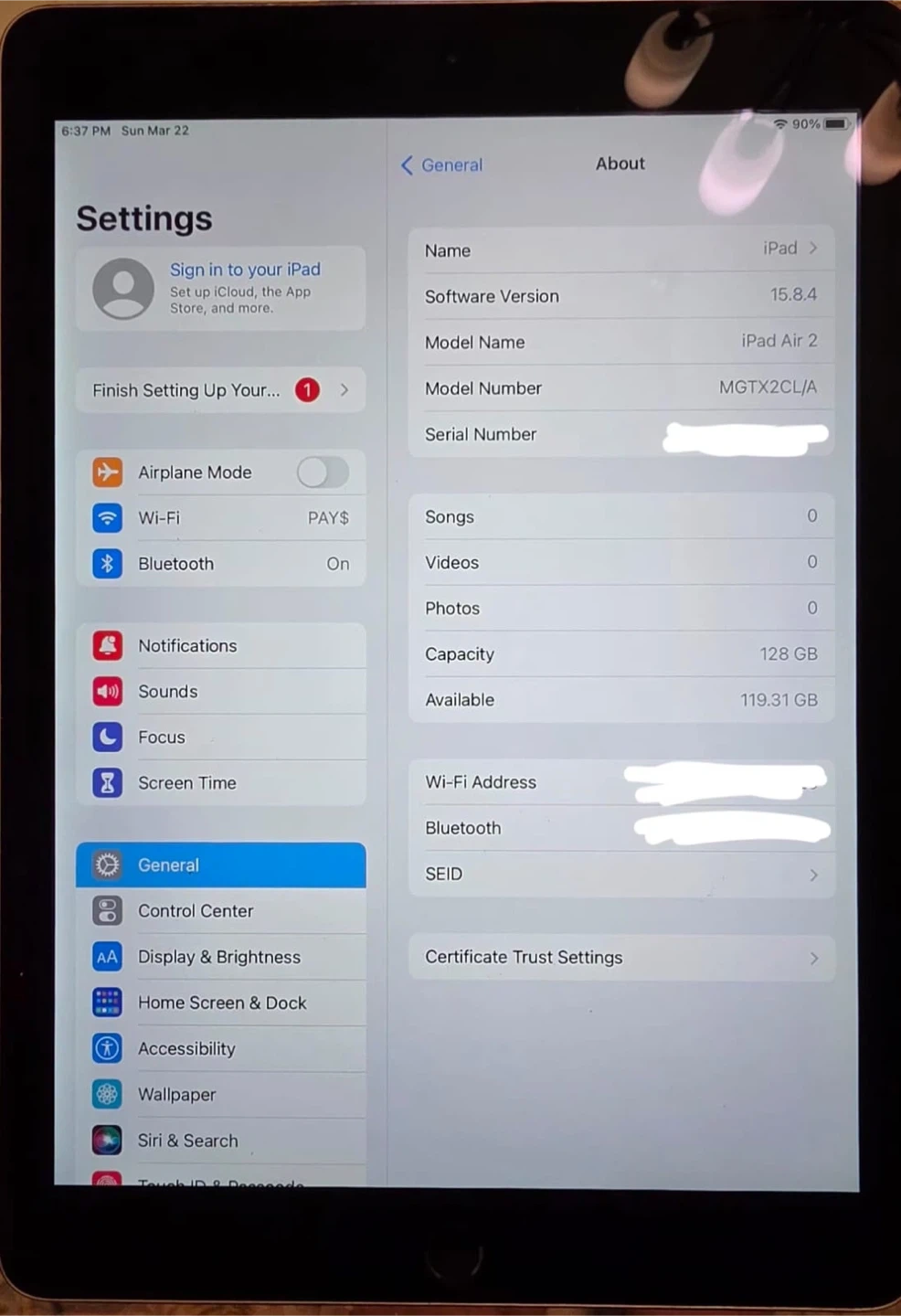 Apple iPad Air 2 tablet with 128 GB storage. It's a great device for browsing and apps! Comes with charging adapter only