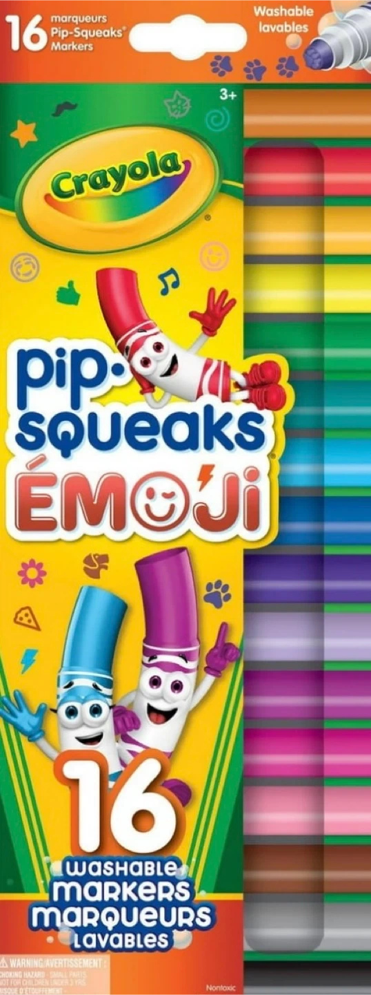 This box includes 16 Pip-Squeaks washable markers. They're great for drawing and colouring. Markers are non-toxic and suitable for ages 3 and up.