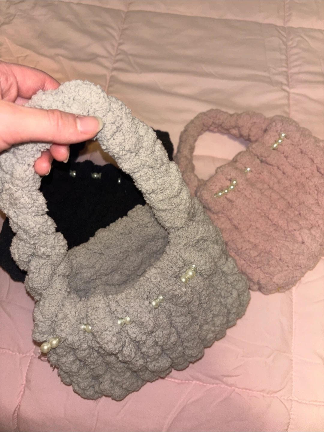 Handmade cute crocheted mini handbags. They're decorated with faux pearls along the top closure. The yarn is super soft and chunky. Perfect for holding small essentials.