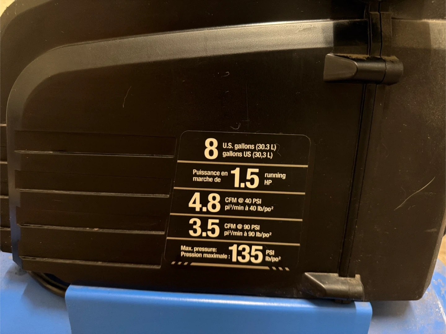 Mastercraft 8 U.S. gallon air compressor. It's got a 1.5 running HP motor and a max pressure of 135 PSI. CFM is 4.8 at 40 PSI and 3.5 at 90 PSI. This compressor is ready for various shop tasks!