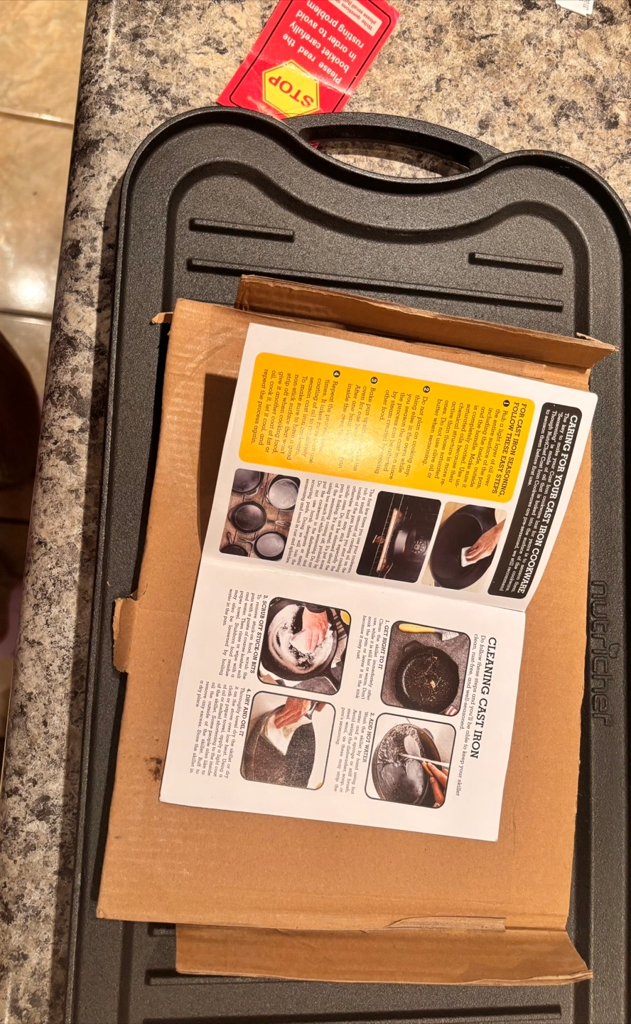 Rectangular cast iron grill pan. Has ribbing on one side. Reversible sides, with flat or grilled surface. The pan comes in the original box. It's the perfect size for a relaxing night of cooking.