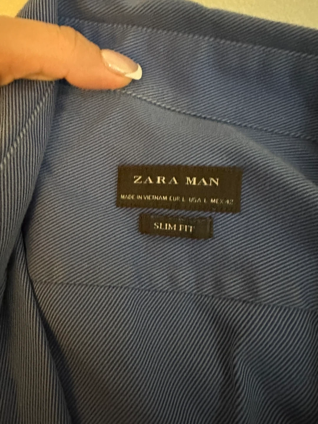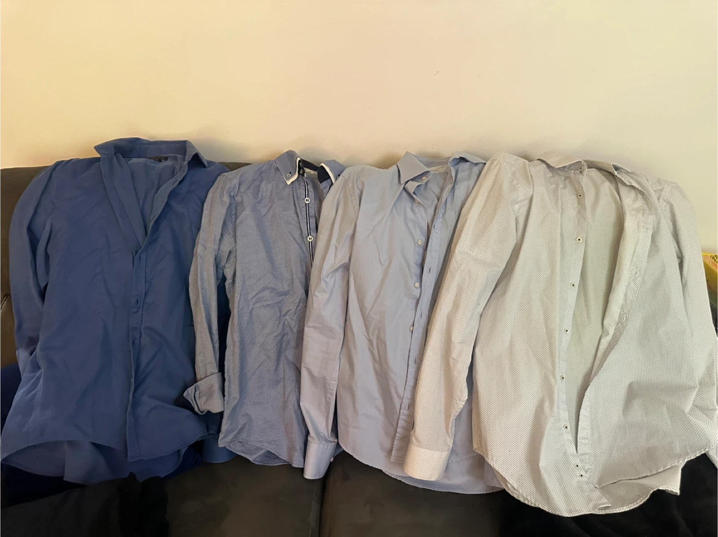 Selling a set of Zara Man slim fit shirts. There are four shirts in total, all size medium. They come in a variety of blue and white colours.