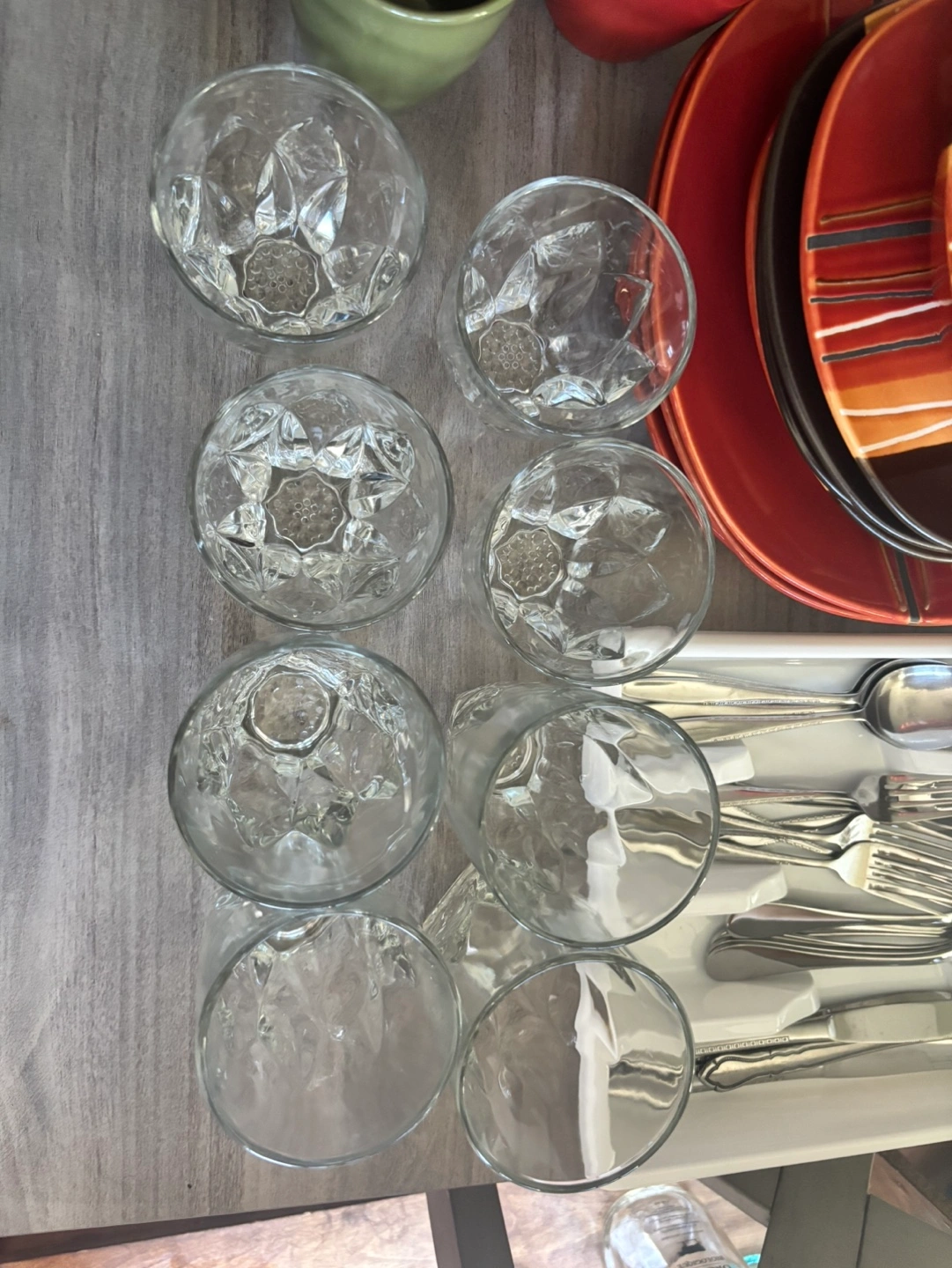 Set includes plates, bowls, mugs and glasses. Orange, brown and black colour scheme. Only one mug from the set is missing. The plates have only been used a few times. Asking $10 or best offer.