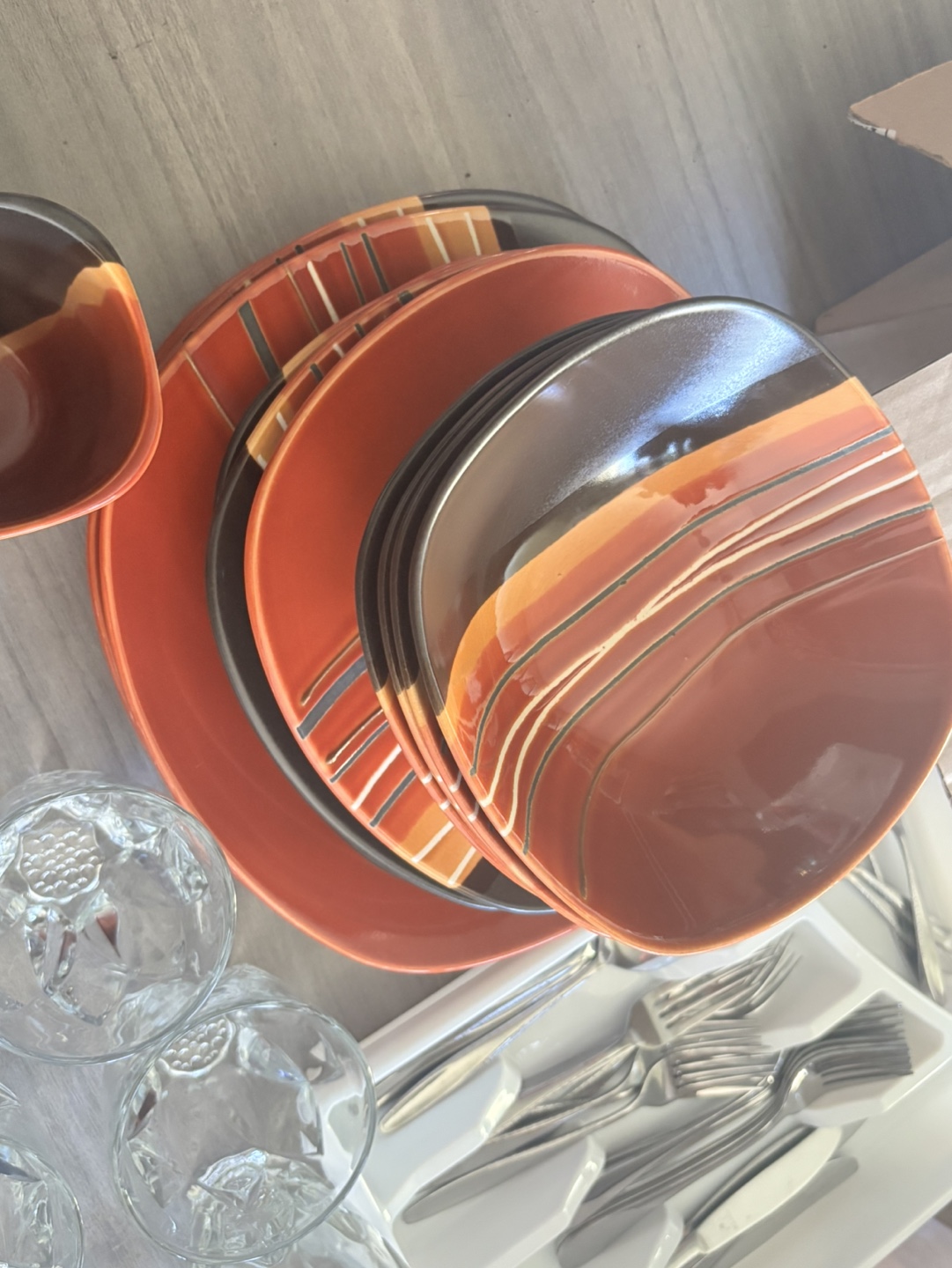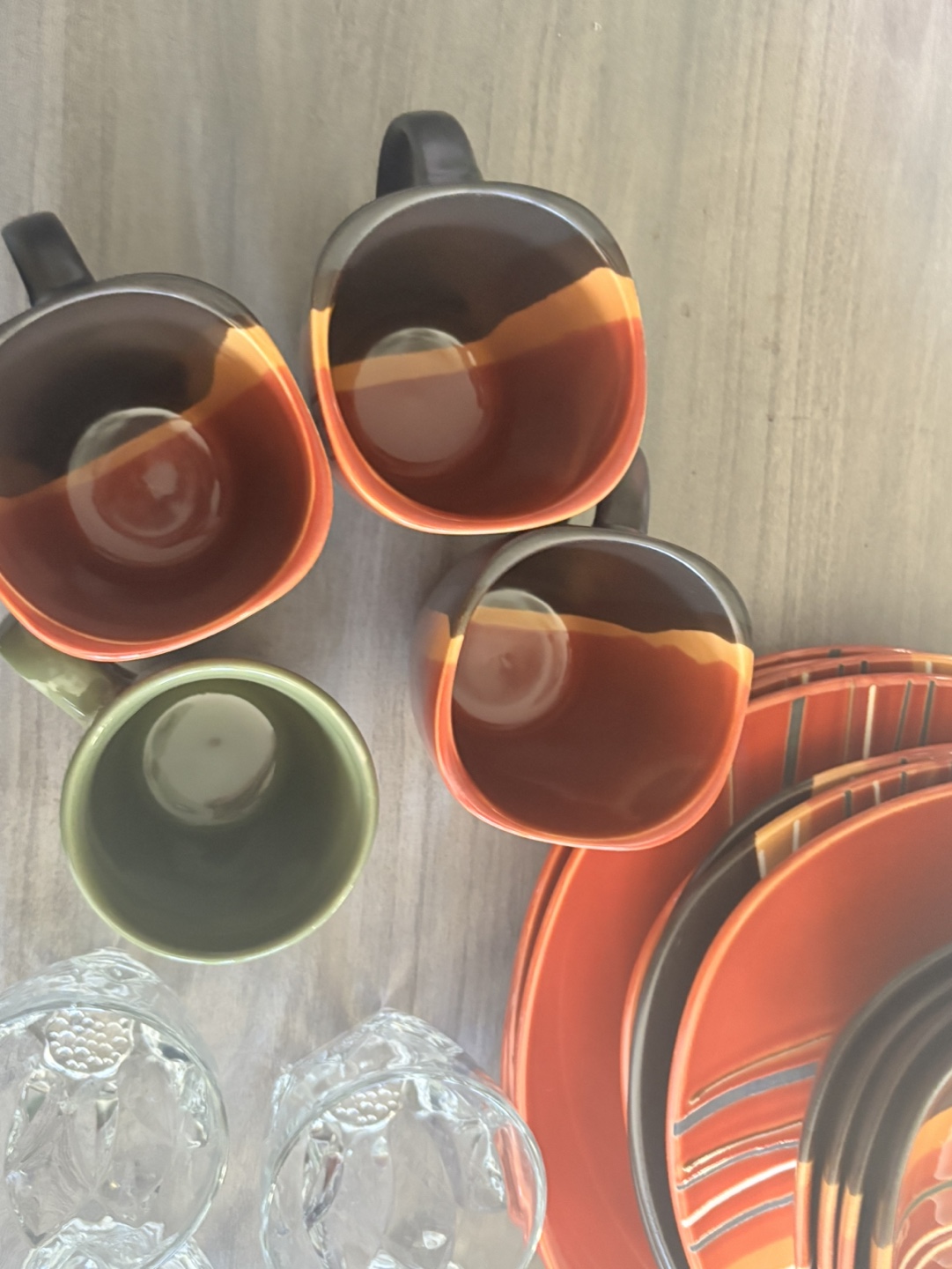 Set includes plates, bowls, mugs and glasses. Orange, brown and black colour scheme. Only one mug from the set is missing. The plates have only been used a few times. Asking $10 or best offer.