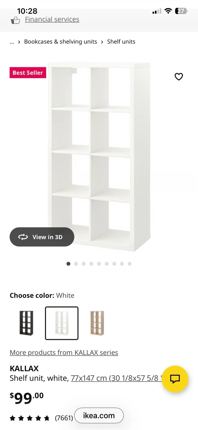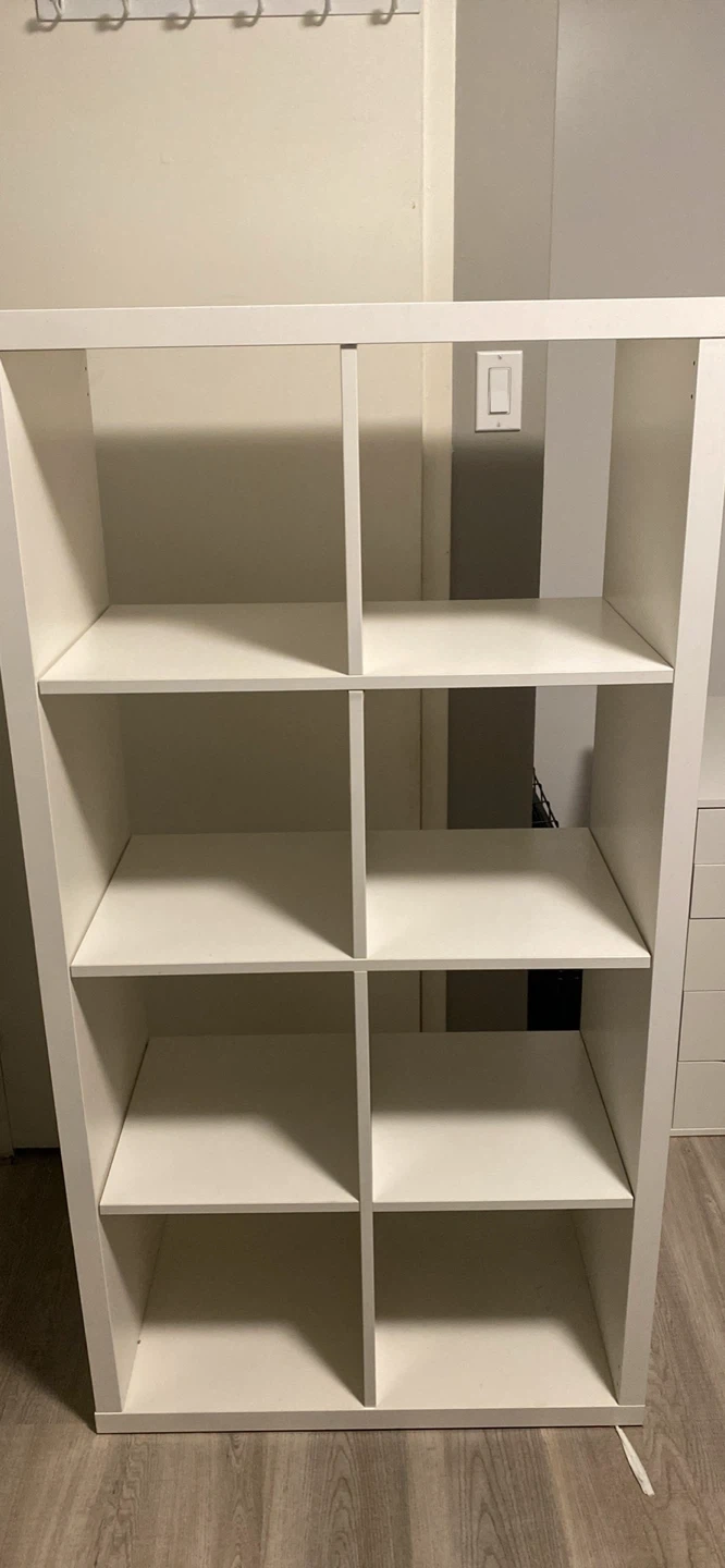White IKEA KALLAX shelf unit. It's 77x147 cm (30 1/8x57 5/8"). This versatile shelving unit is perfect for organizing books, decor, and more.