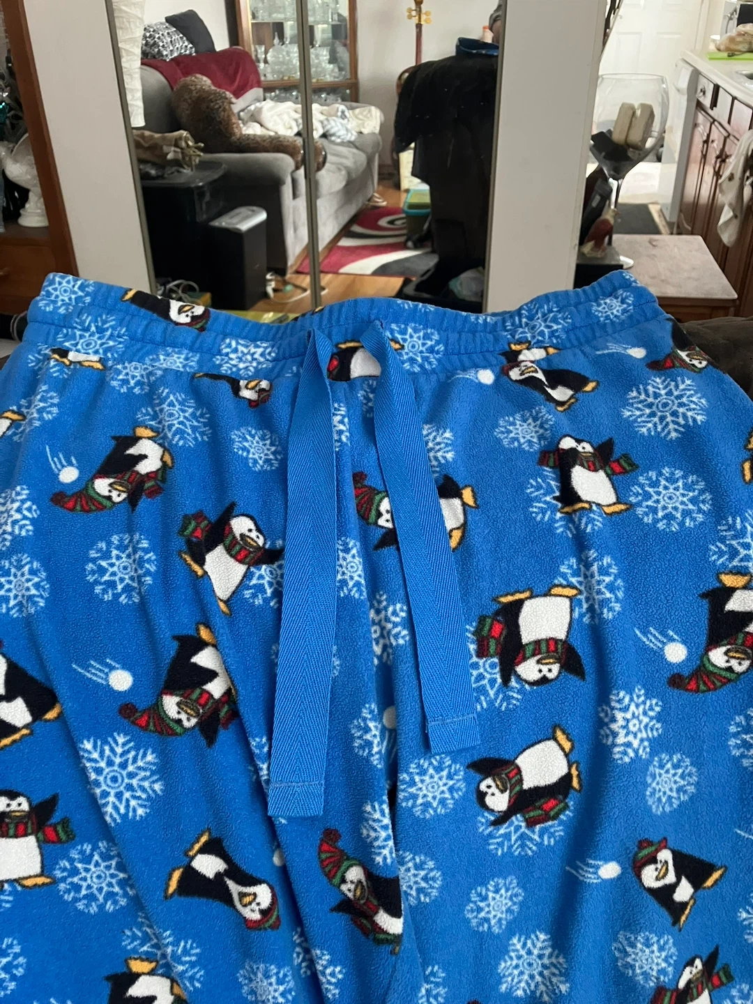 Cozy blue fleece pajama pants with a fun penguin and snowflake print. They feature an elastic waistband with a drawstring for a comfortable fit. Perfect for lounging during the winter months!