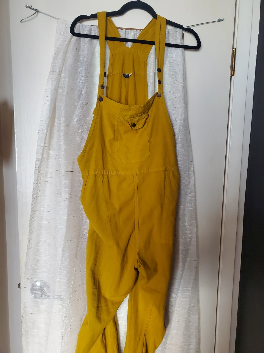These yellow overalls are made of 100% cotton and are a size large. They were made in Nepal. The overalls have a bib pocket with a button closure.