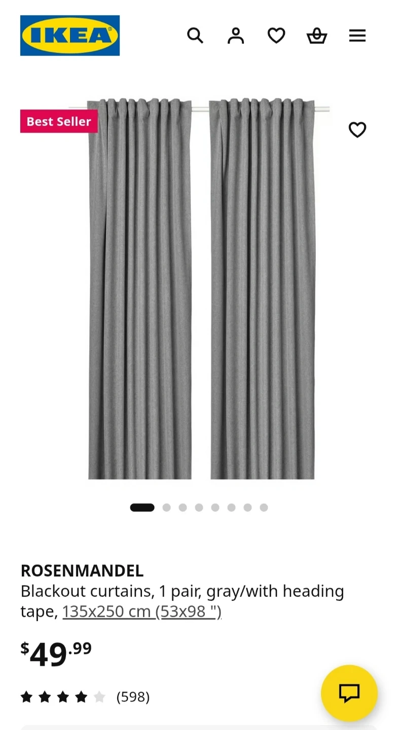 ROSENMANDEL blackout curtains, 1 pair, gray with heading tape. Dimensions are 135x250 cm. These curtains block out most light.