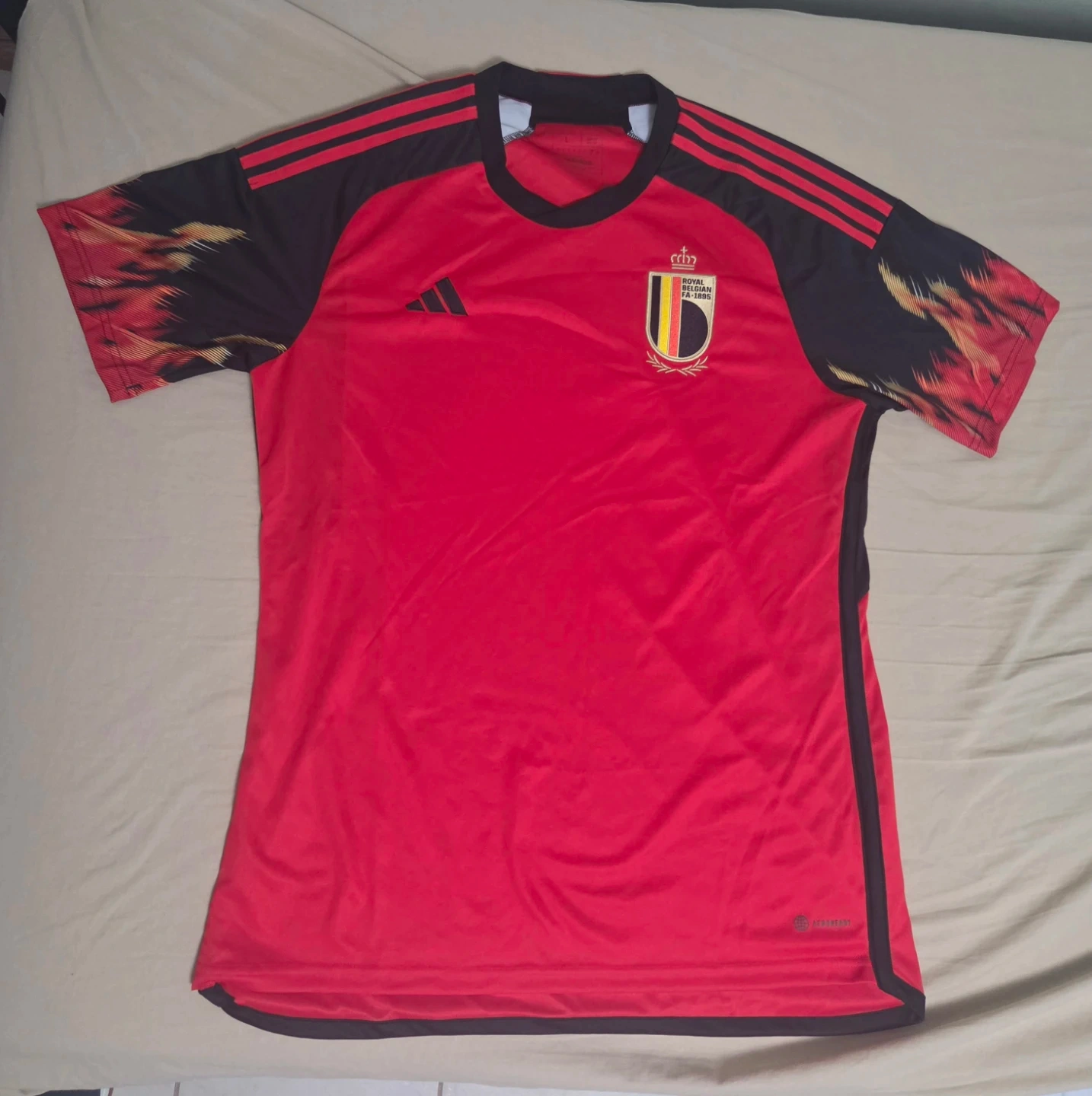 Selling an Adidas Belgium soccer jersey in size L. The jersey is red with black accents and features the Belgium national team crest. It's in great condition!