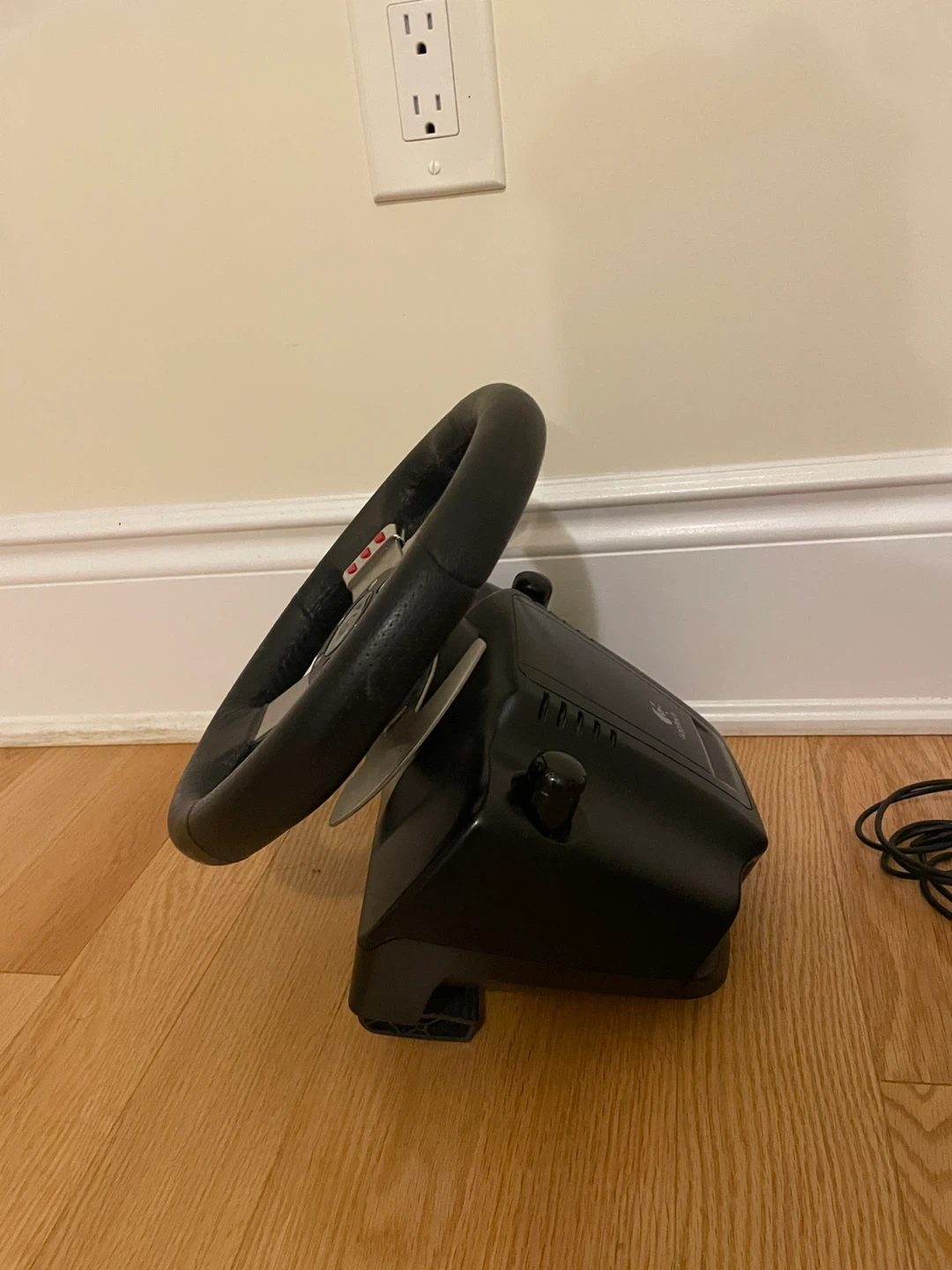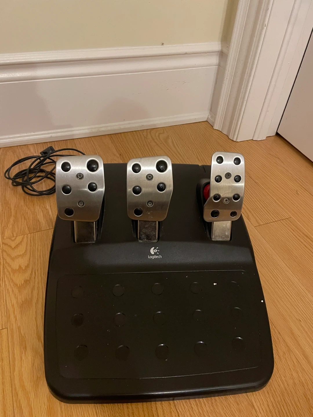 Logitech G27 racing wheel with 3-pedal set (clutch, brake, gas).