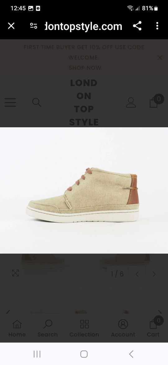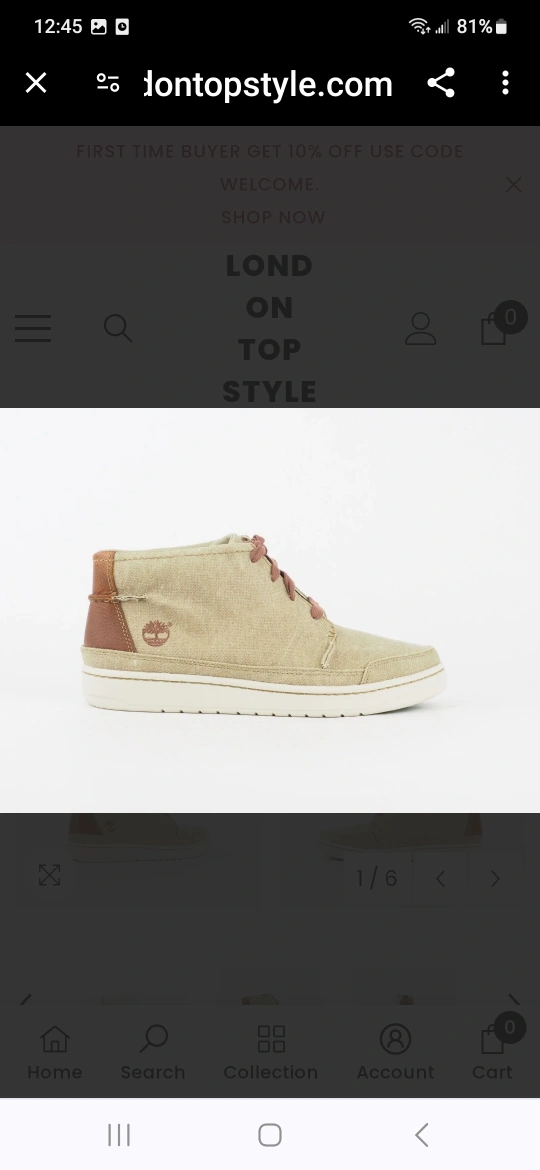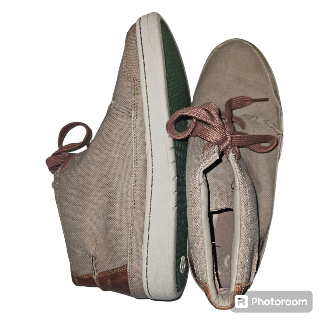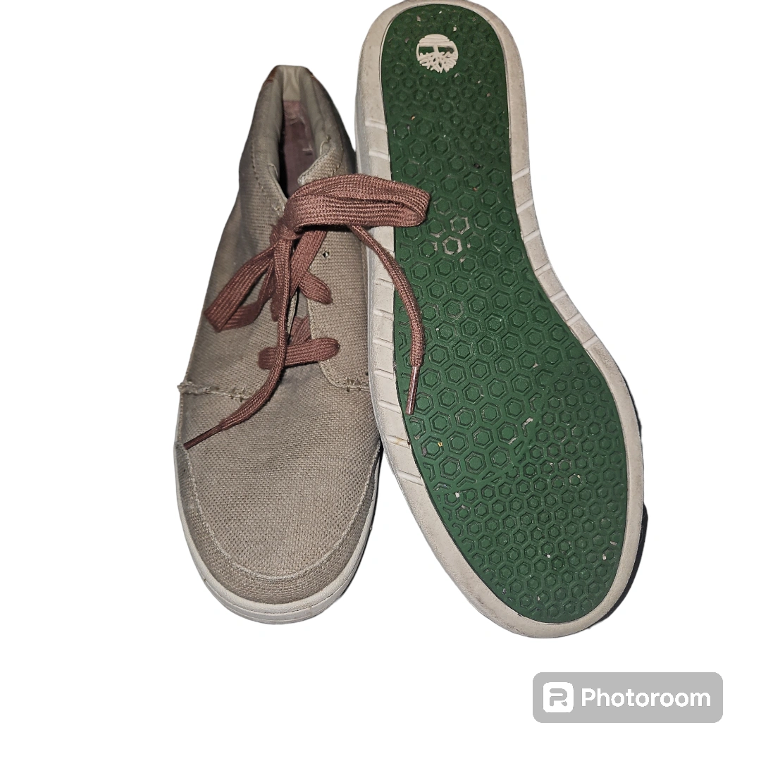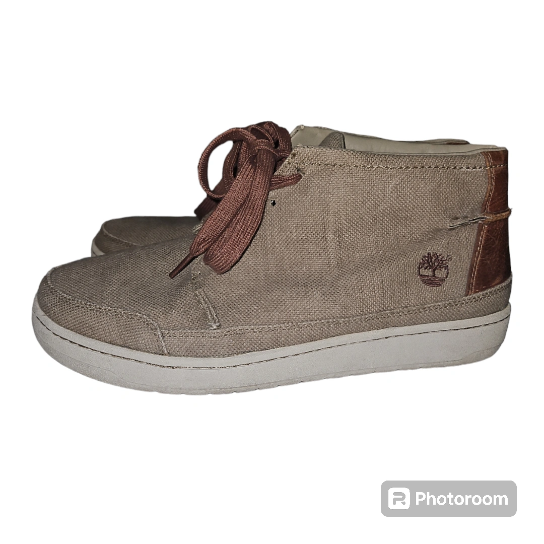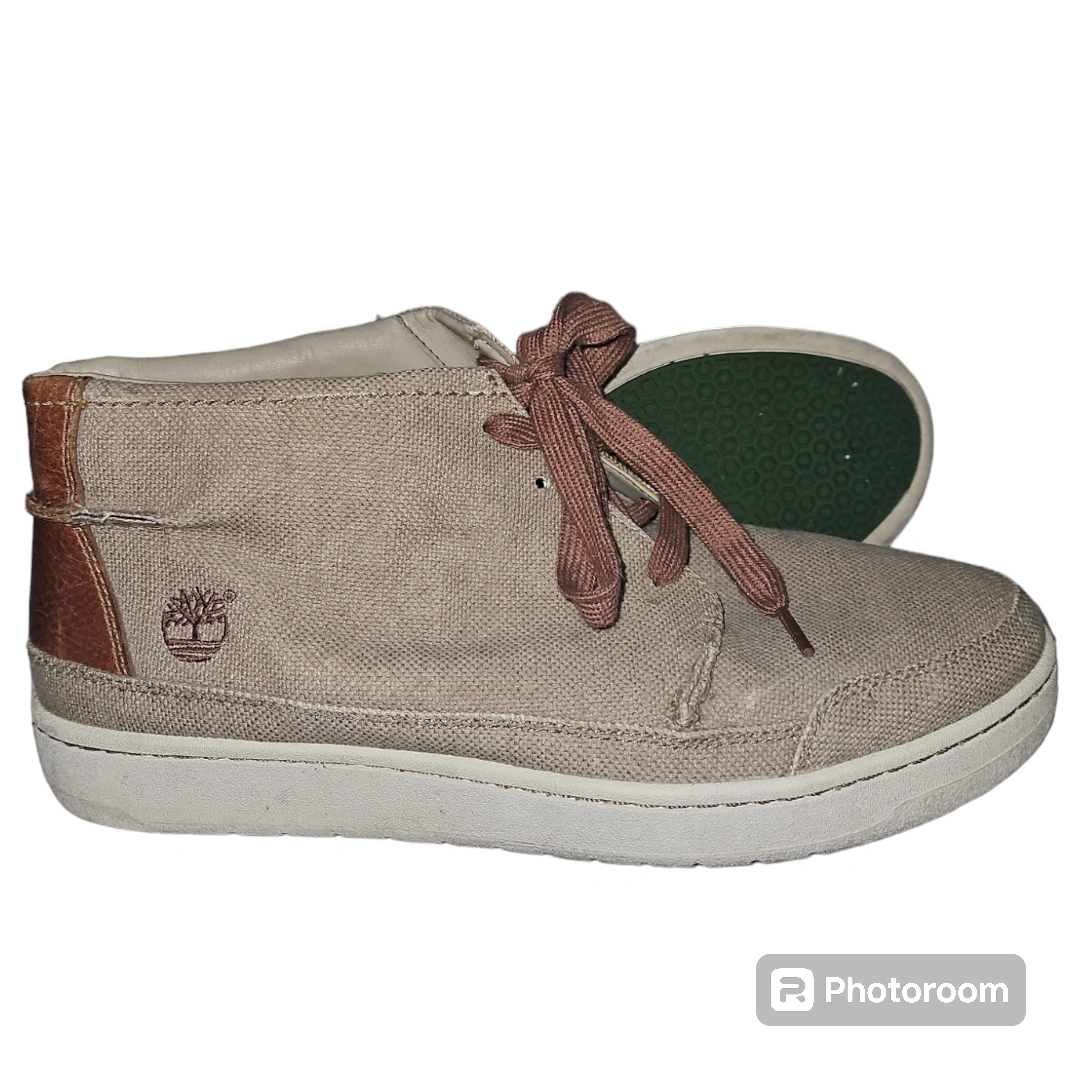 Timberland Beige textile. Casual, lace up Chukka canvas high-top shoes with brown laces. They have a white sole with a green honeycomb pattern. There is a brown leather accent on the back of the shoe.