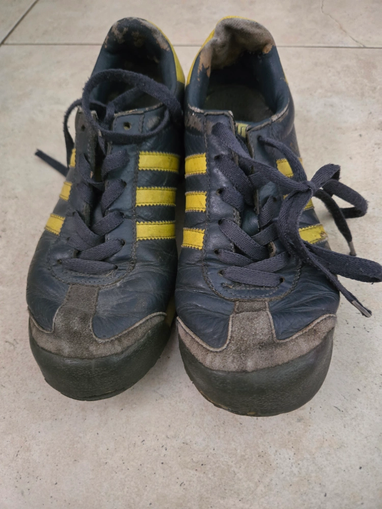 Pair of used Adidas Rom low-top sneakers. Dark blue leather upper, yellow stripes. Worn condition. Original laces included. Great for casual wear or collectors.