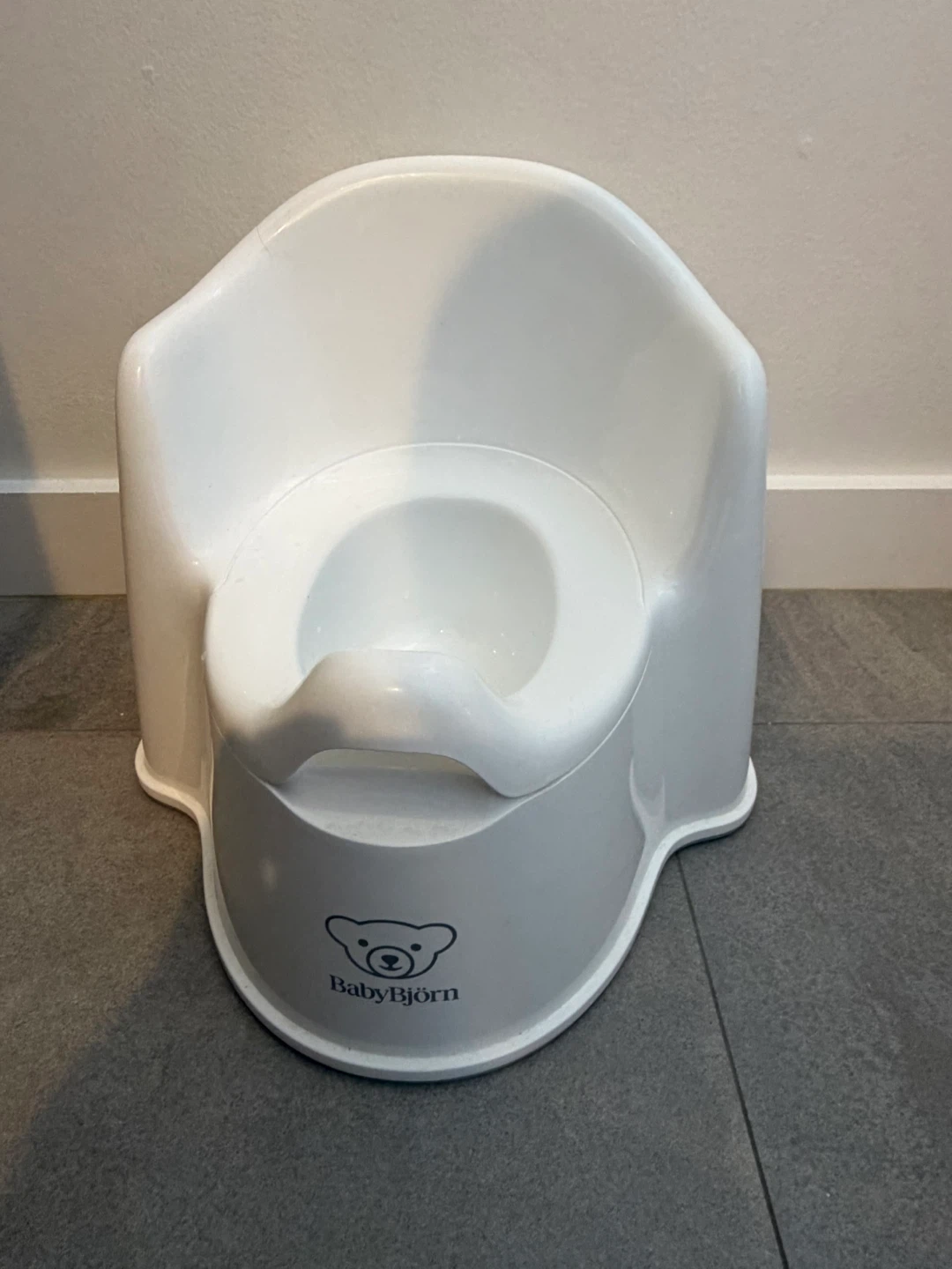 White BabyBjörn potty chair. Durable plastic construction. Easy to clean design for potty training. This potty is great for little ones starting their potty training journey! Barely used, my toddler wasnt into this version.