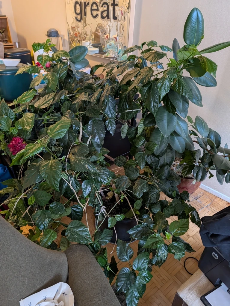Large flowering hibiscus plant. My mom moved in with me and we don't have room for this. It is constantly flowering red/pink flowers. It has many many buds on it.