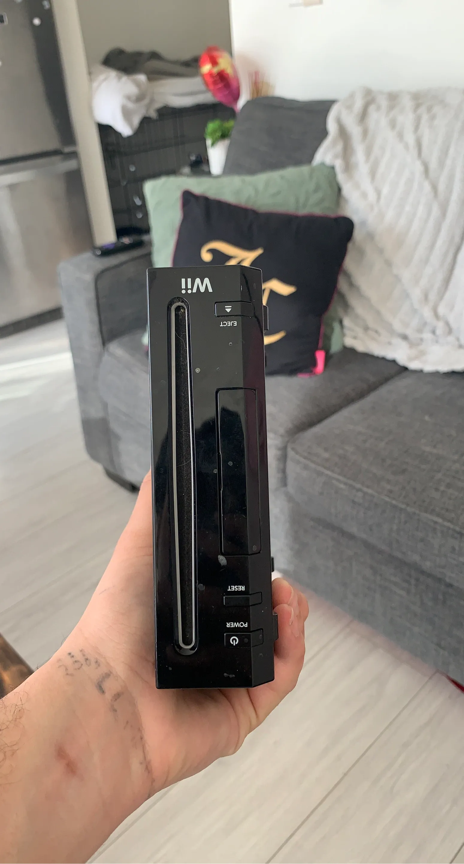 This is a black Nintendo Wii console. It has buttons for Power and Reset. The disc eject button is also visible. 2 remotes n accessories like baseball bat n wheel will give mario kart with it and super mario bros for free also have two guitars for guitar hero