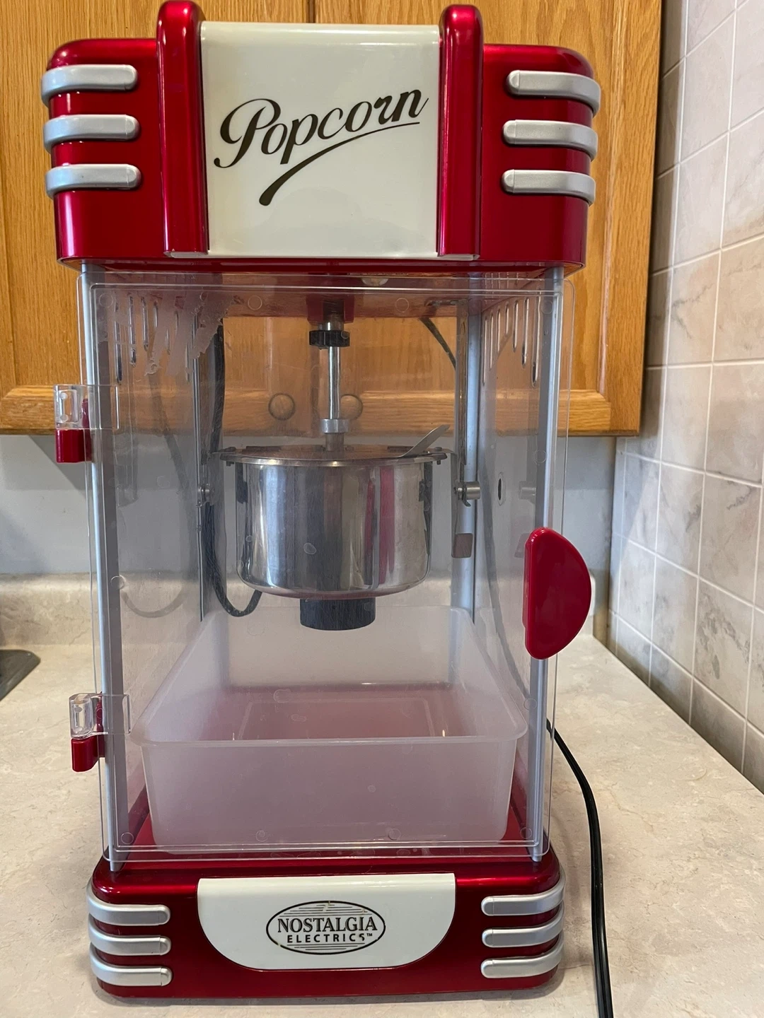 Works well and makes delicious popcorn. Just missing the handle to pour out the remaining popcorn from the container, but easy issue to solve. Classic design adds a fun, retro touch.
