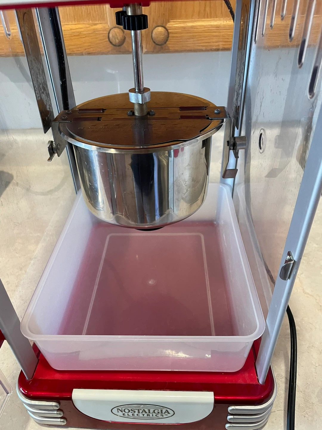 Works well and makes delicious popcorn. Just missing the handle to pour out the remaining popcorn from the container, but easy issue to solve. Classic design adds a fun, retro touch.