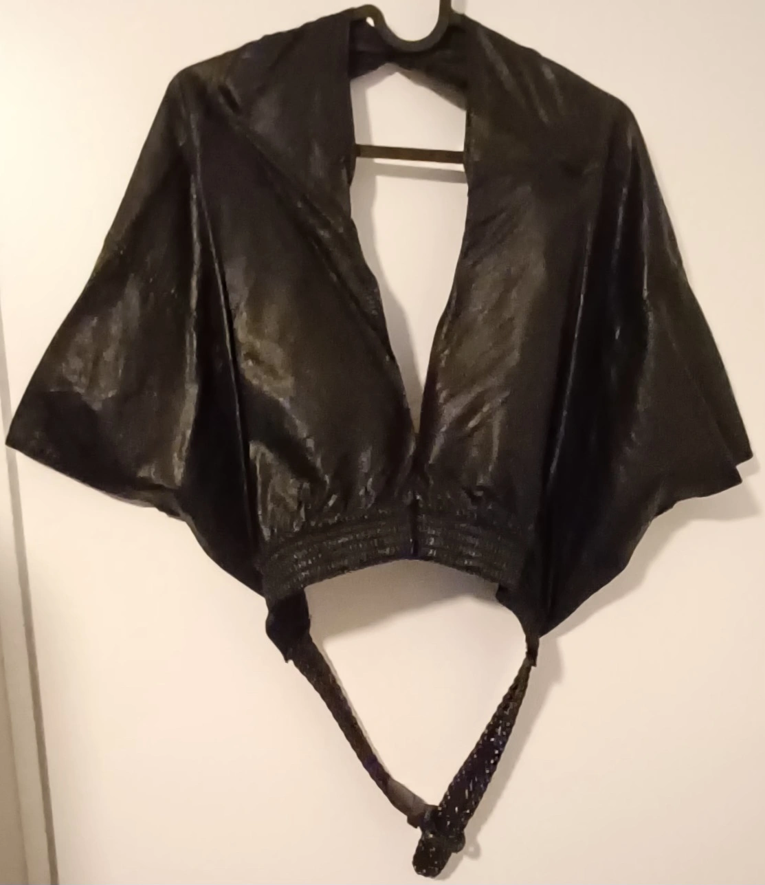 Unique black faux leather cropped bolero. Open back design. Elasticated waist. Features a braided belt detail. Great layering piece. Rad-cycled using old pants and belt, truly one of a kind! 💫♻️✨️