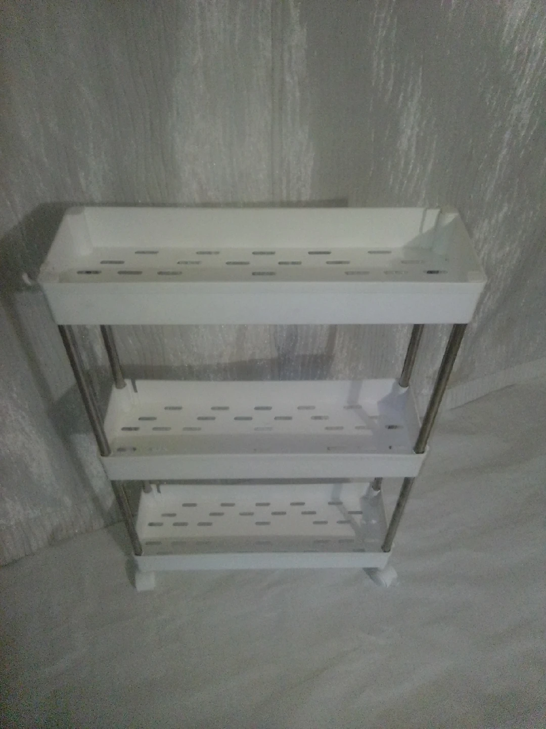 Here's a handy white 3-tier rolling cart! It's perfect for adding some extra storage in your kitchen, bathroom, or anywhere else in your home. This cart is easy to move around thanks to its smooth-rolling wheels