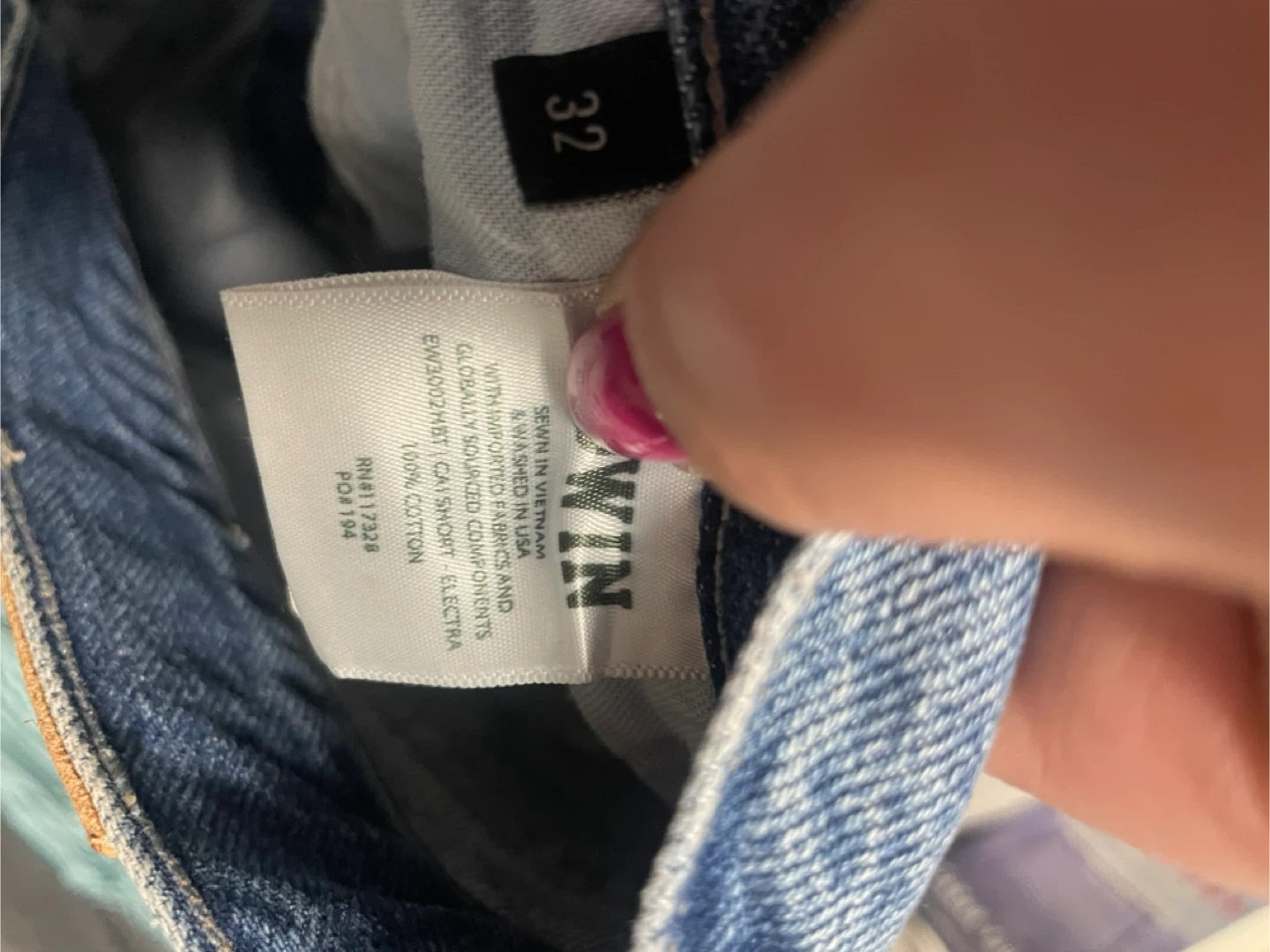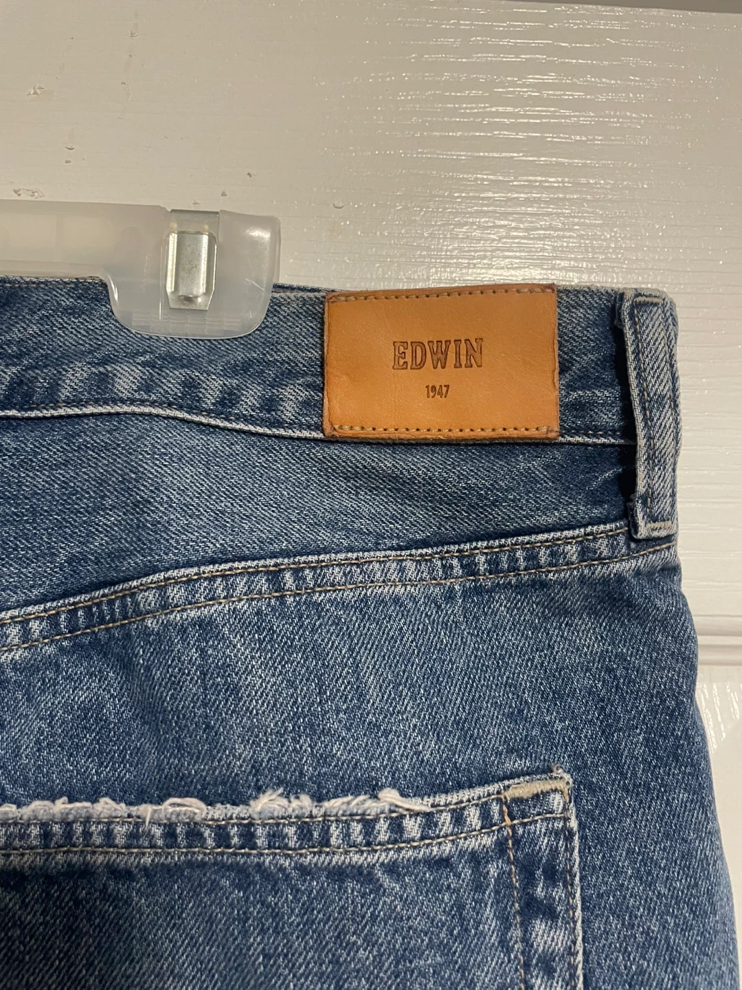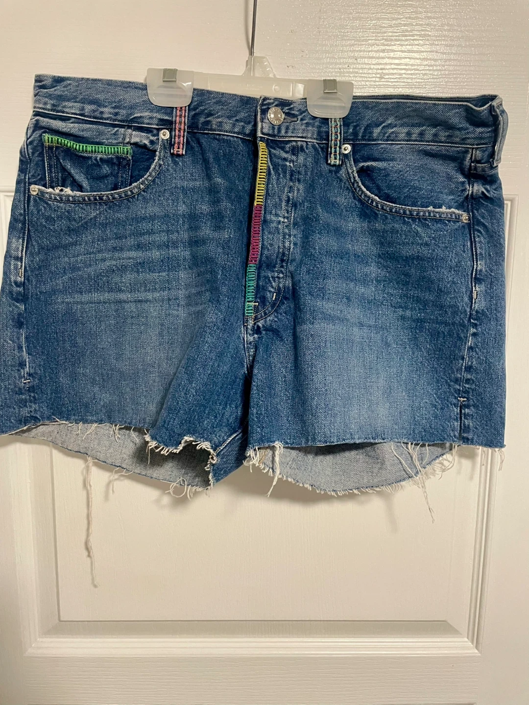 These are EDWIN "Cai Short" cut-off denim shorts. They're made of blue denim with colourful stitching detail. Perfect for casual wear in warmer weather!