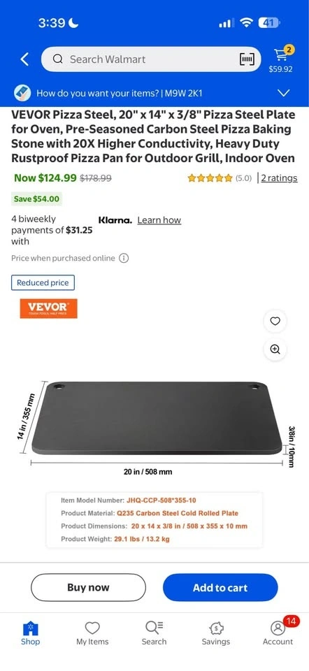 Brand new VEVOR Pizza Steel, 20" x 14" x 3/8". This pre-seasoned carbon steel plate offers rapid and even heating with 20x higher heat conductivity than ceramic stones for a crispy pizza. Its 3/8" thickness retains heat longer. The steel is heavy-duty, rustproof, and easy to clean with just water and a cloth. Features a convenient thumb hole for hanging and polished edges for safety. Great for indoor ovens or outdoor grills, and can also be used for bread, cookies, steaks, and more. Located at 71 Judson St, Etobicoke (side entrance). More items like this on my page.