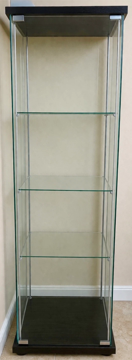 This display cabinet is made of glass and metal. It's perfect for showcasing collectibles or decor. The cabinet has four shelves for ample storage space.