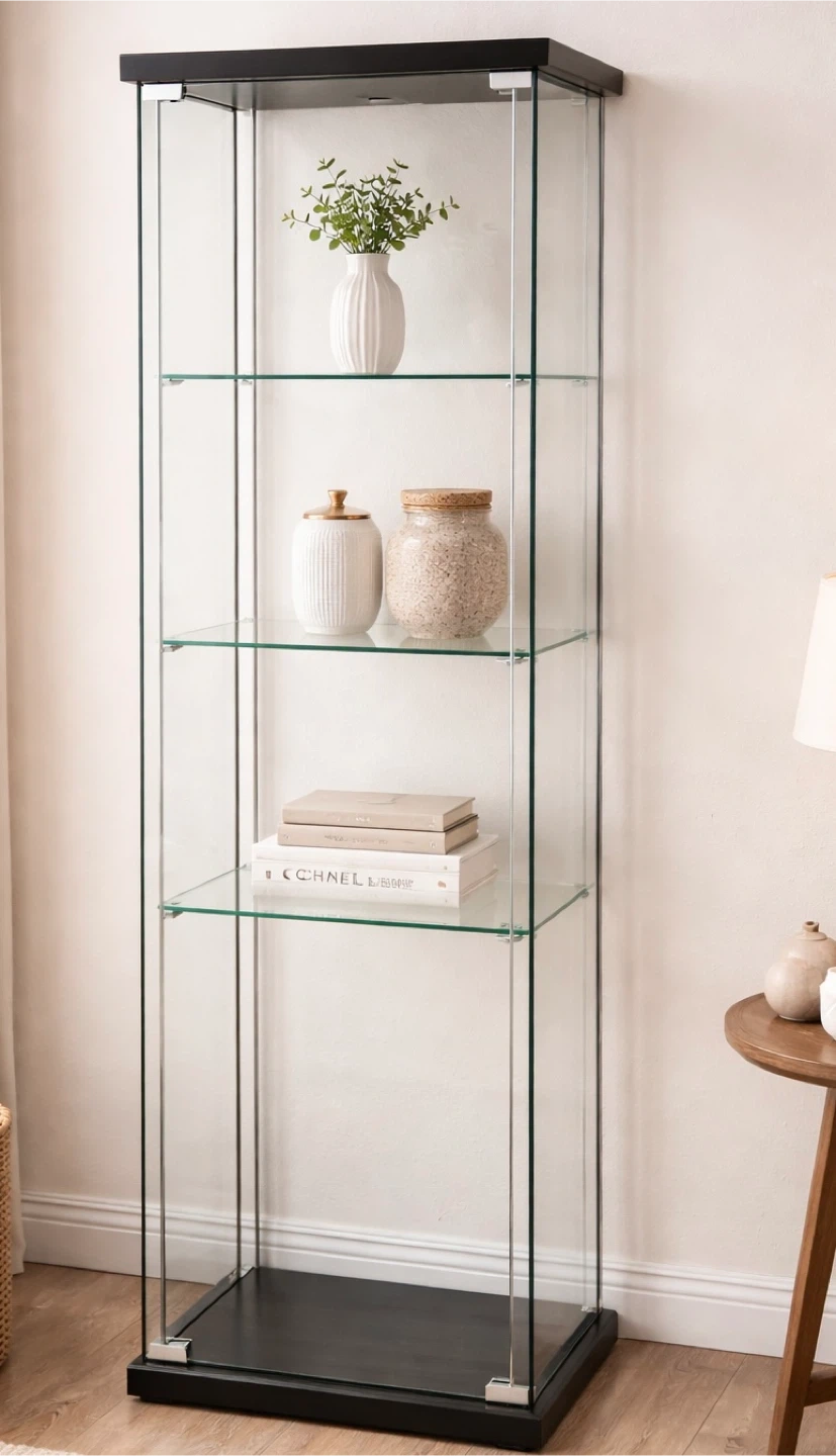 This display cabinet is made of glass and metal. It's perfect for showcasing collectibles or decor. The cabinet has four shelves for ample storage space.