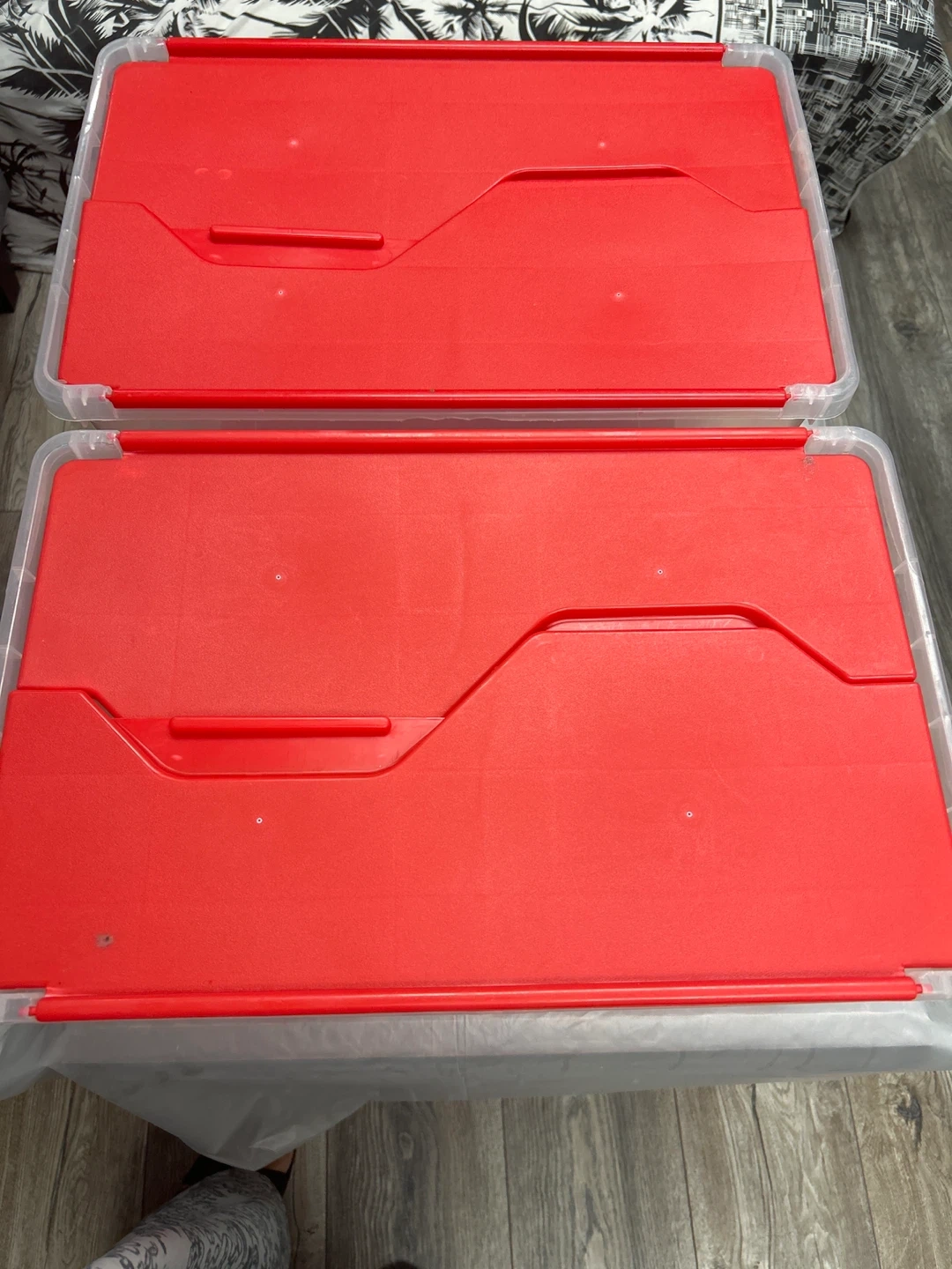 This is GSC Mini Flip Tote storage containers. They have a 25 L capacity and a red lid. Dimensions are 18" x 12" x 8". 2 item for $3