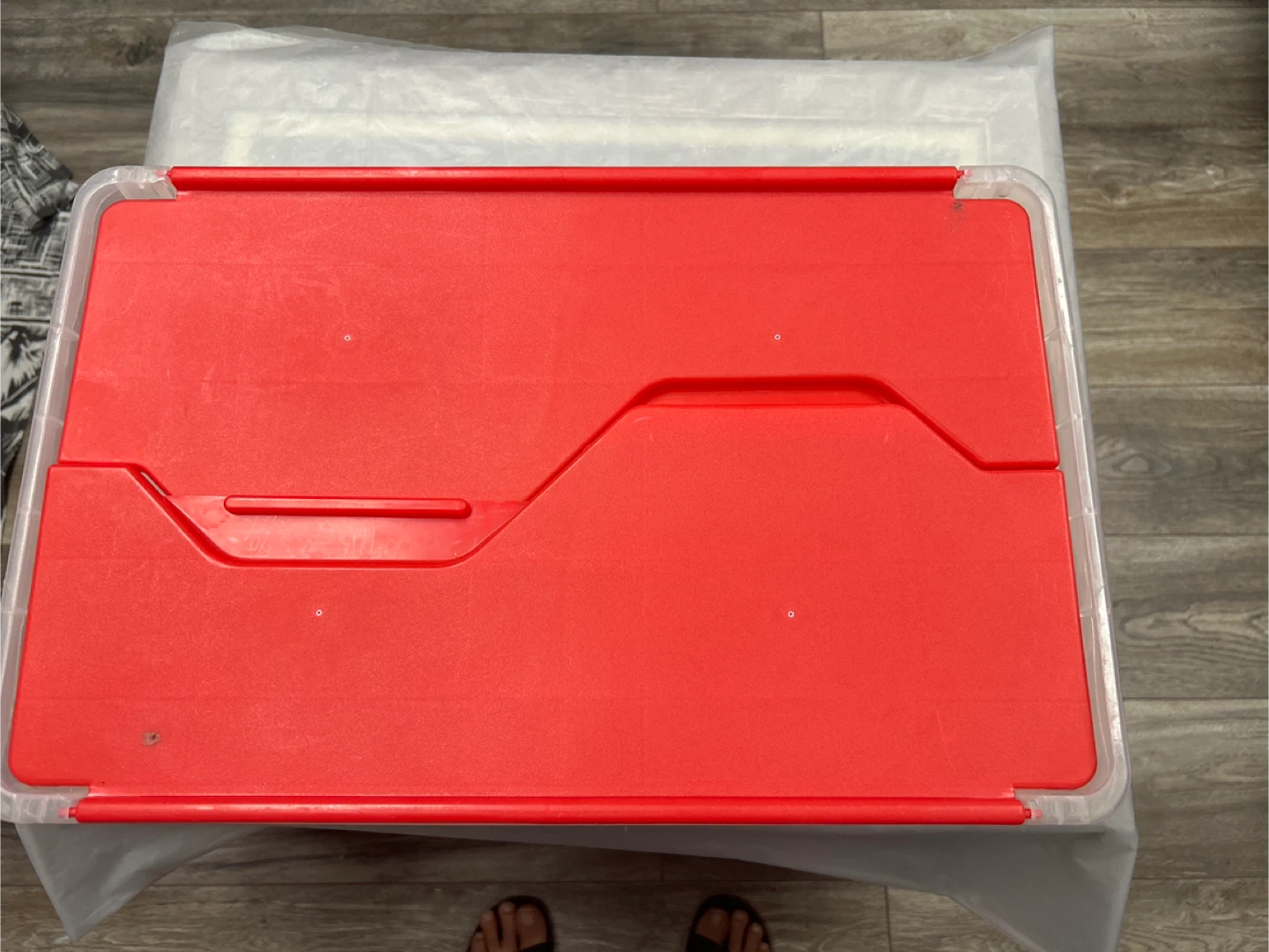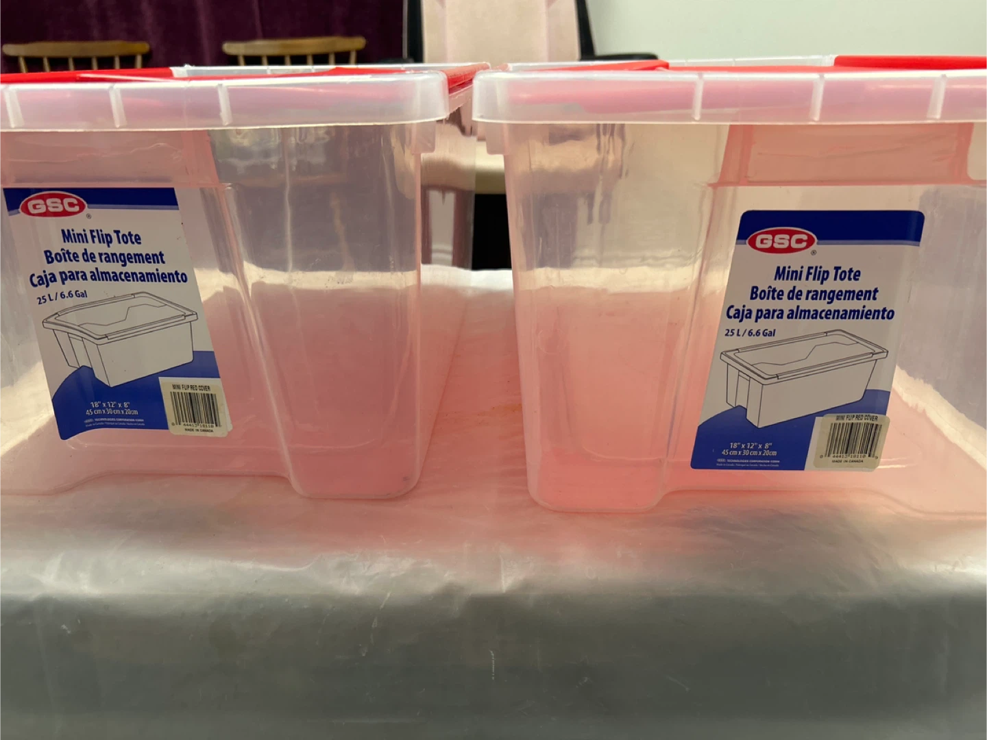 This is GSC Mini Flip Tote storage containers. They have a 25 L capacity and a red lid. Dimensions are 18" x 12" x 8". 2 item for $3