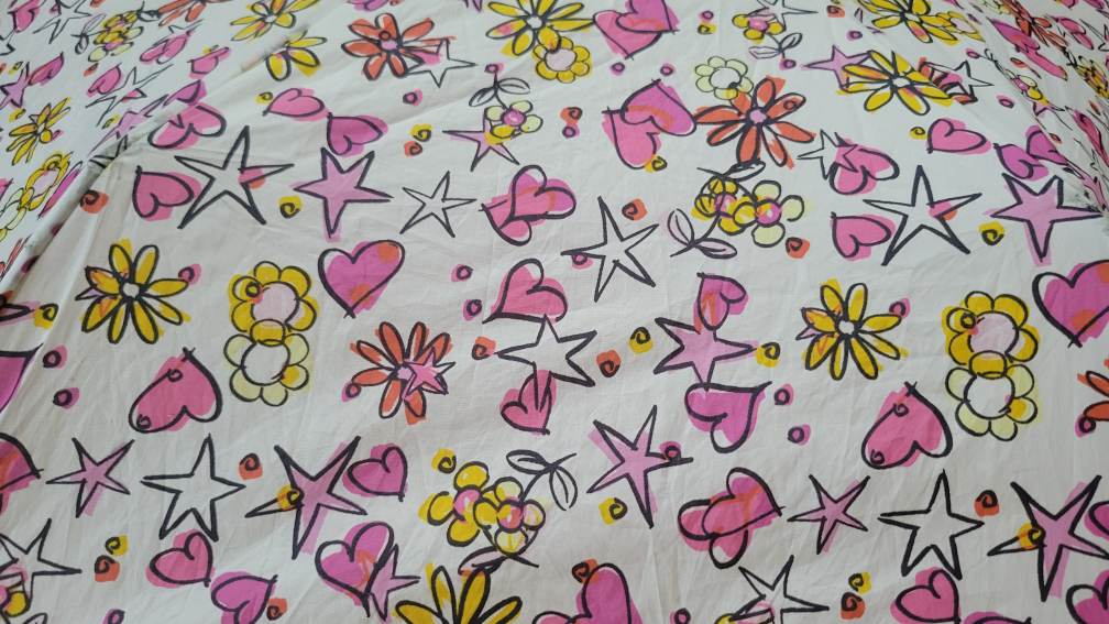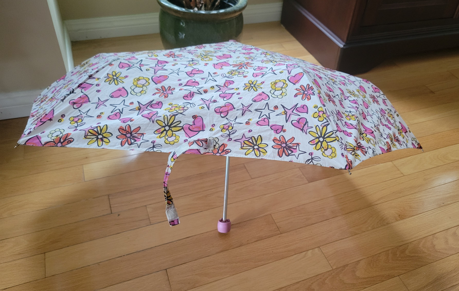 Here's a cute umbrella with a fun floral pattern! It's perfect for those rainy days and will definitely brighten up your day. The umbrella is in good condition and ready to keep you dry in style
