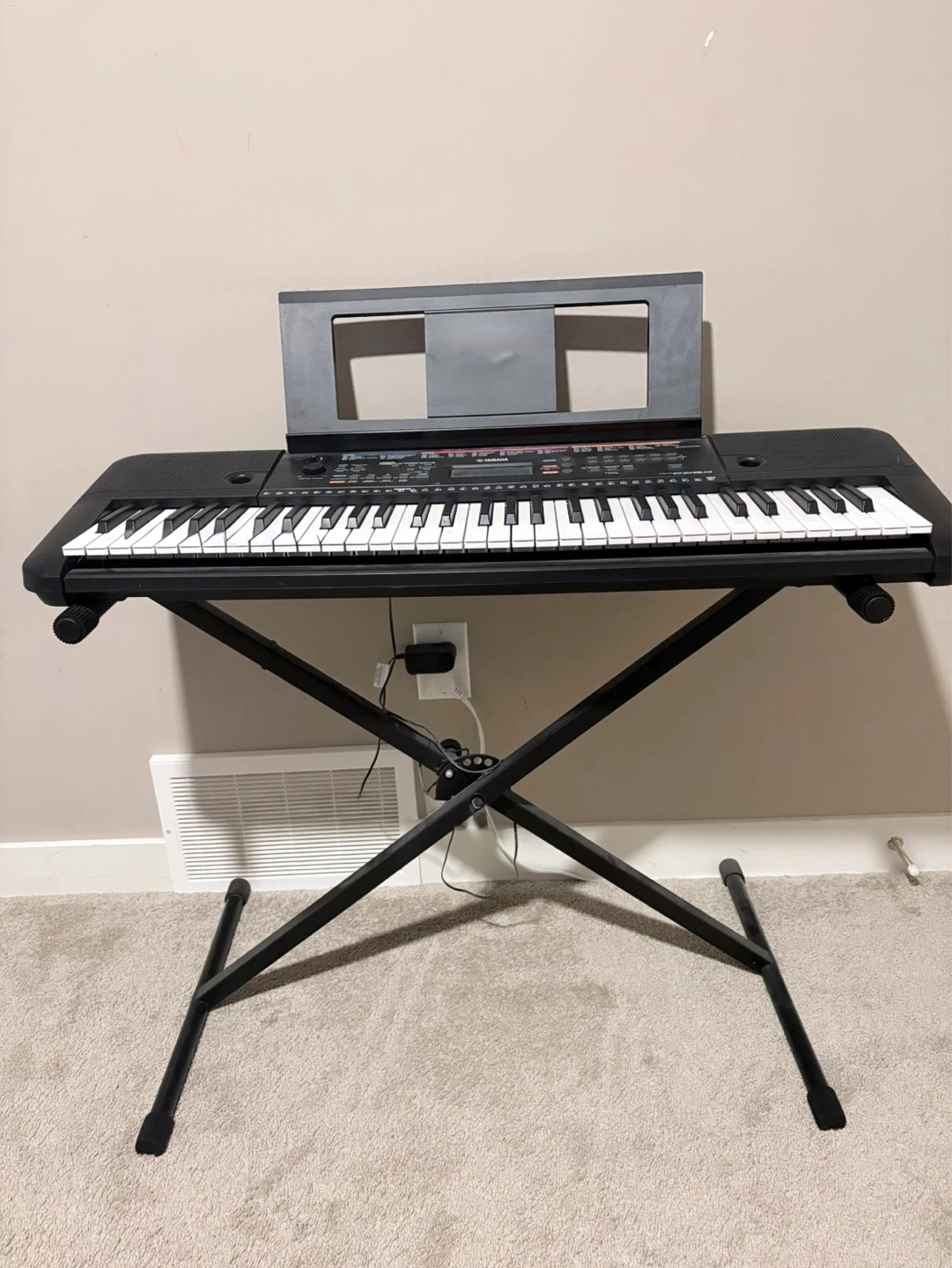 Yamaha electronic keyboard with a sturdy X-style stand included. It has a black finish and a built-in music rest. This keyboard is great for learning to play!