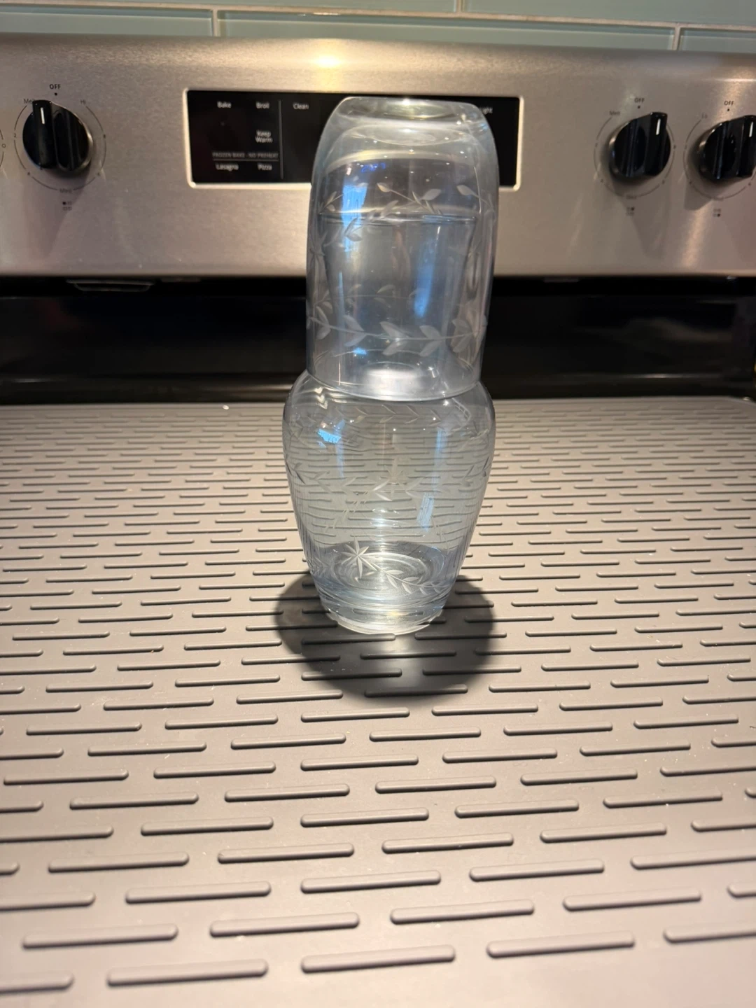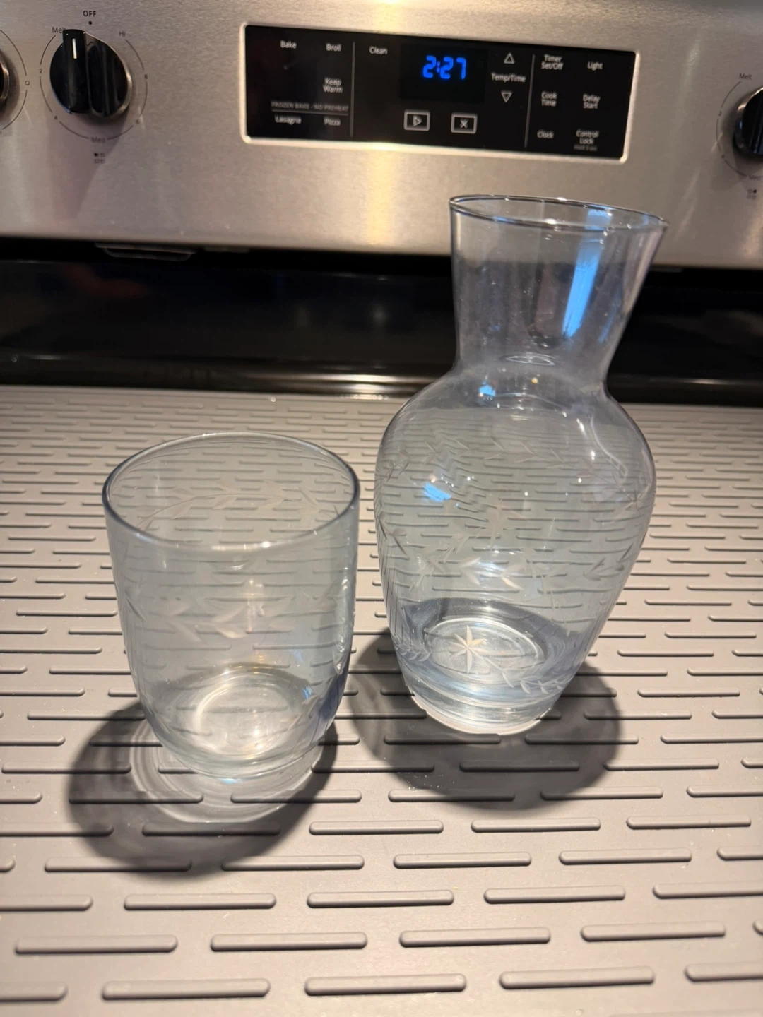 This is a lovely glass water carafe with an etched floral pattern. It includes a matching tumbler that fits neatly on top. Perfect for bedside tables or a desk!