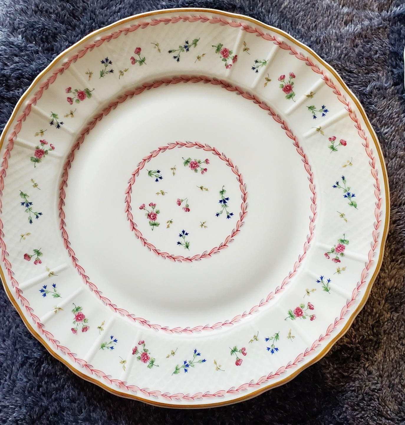Selling complete Bernardeaux Limoge service for 5. New (never used) elegant, beautiful, vintage French porcelain dinnerware. The "Artois Rose" pattern features a beautiful floral design on a white fluted background with gold rim. Each 5 piece set includes dinner plate, salad plate, bread plate, coffee cup and saucer. A unique and exquisite addition to your table. All pieces are New, authentic, and in perfect condition.