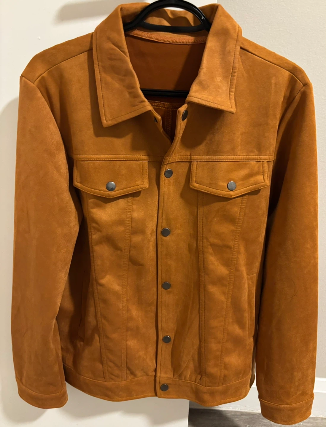 This is a brown suede trucker jacket. It has two chest pockets with snap closures and a button-up front. This jacket is great for layering in cooler weather!
