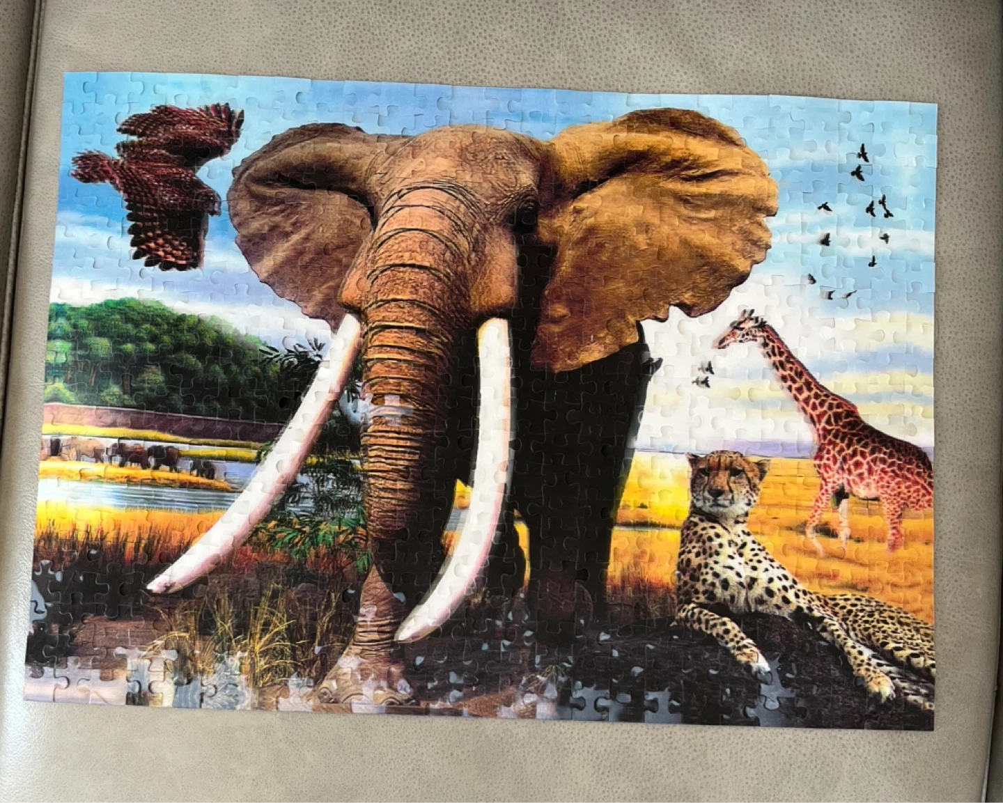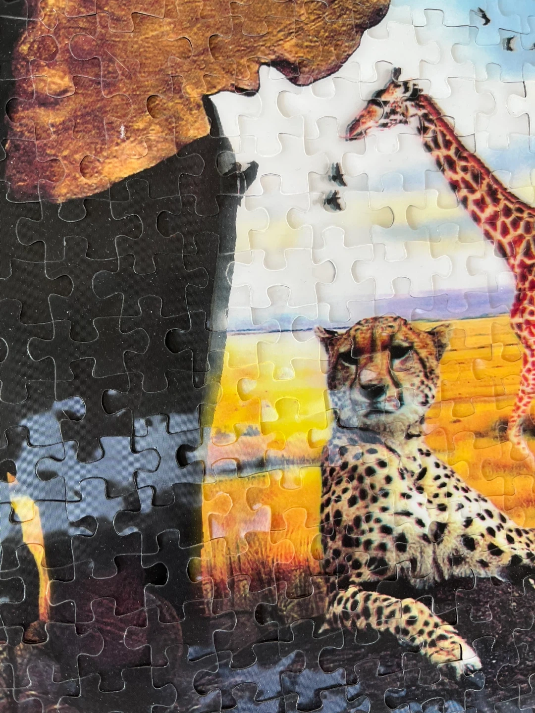 A 3D jigsaw puzzle featuring African wildlife, including an elephant, giraffe, cheetah, and eagle. Great for animal lovers and puzzle enthusiasts. Assembled puzzle shows a vibrant savanna scene.