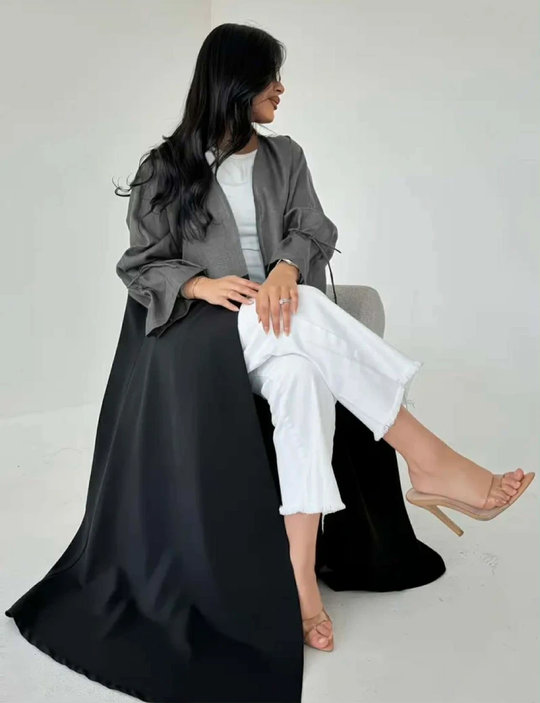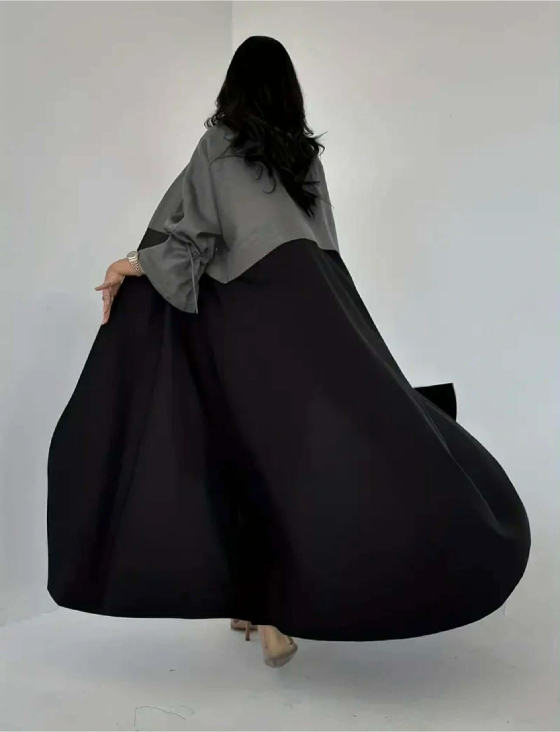 This stylish abaya features a grey upper section with decorative sleeve ties and a flowing black lower skirt. It's designed for a comfortable, modest fit. Perfect for everyday wear or special occasions!