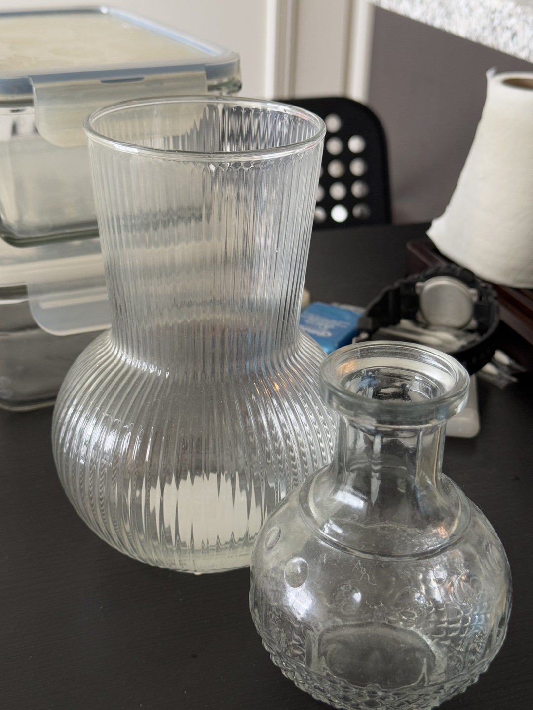A pair of glass vases. One larger, with a ribbed design. The other, a smaller spherical vase. Place some wildflowers inside to give your home a nice touch.