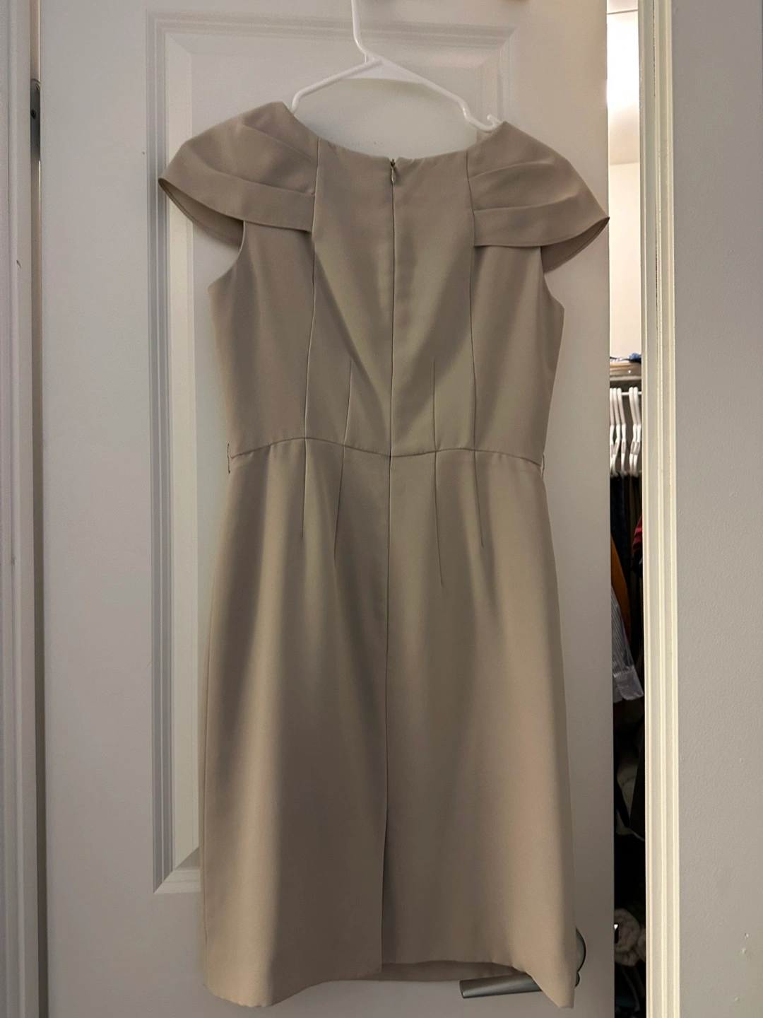 Sleeveless, knee-length dress with a fitted bodice and a-line skirt. The dress has a subtle sheen and features a zip fastening at the back.