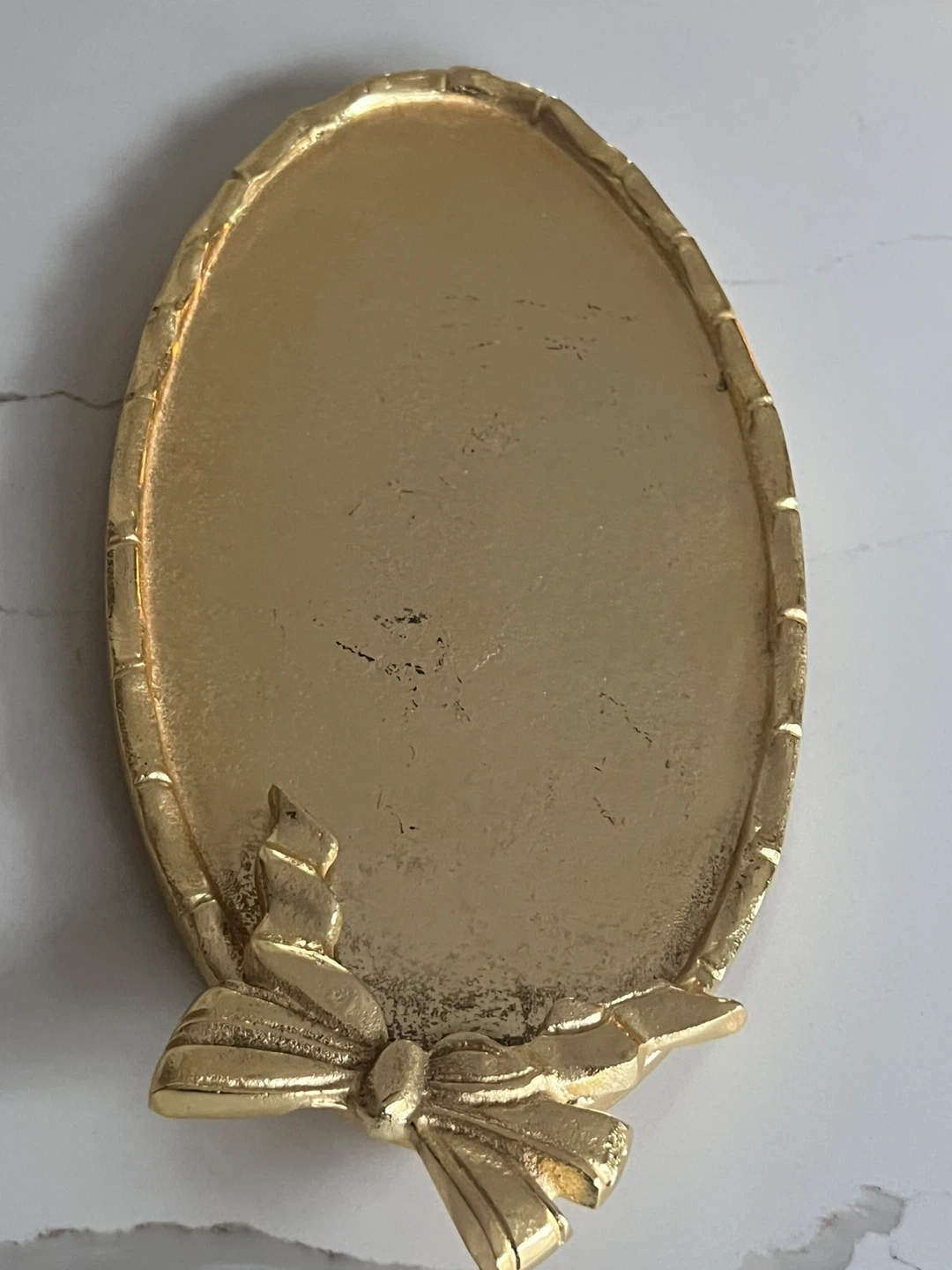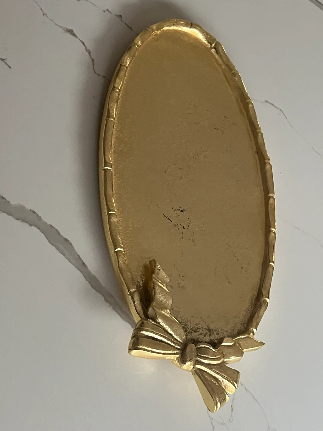 A small oval tray in a shiny gold finish, featuring a decorative bow accent. It's suitable for holding small trinkets or as a decorative piece. This tray has a metallic sheen.