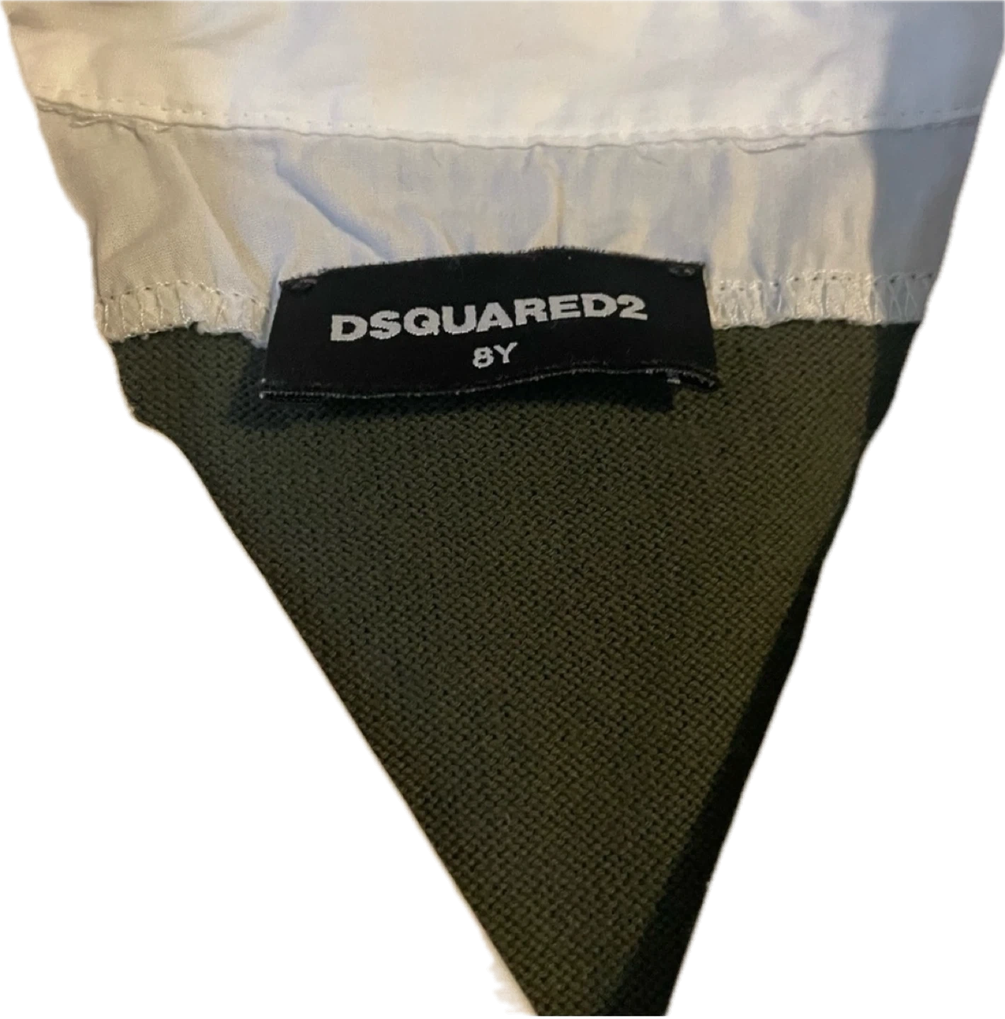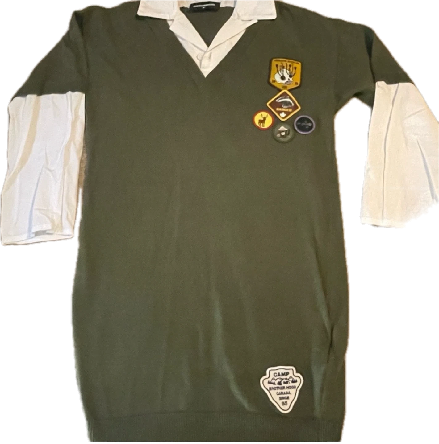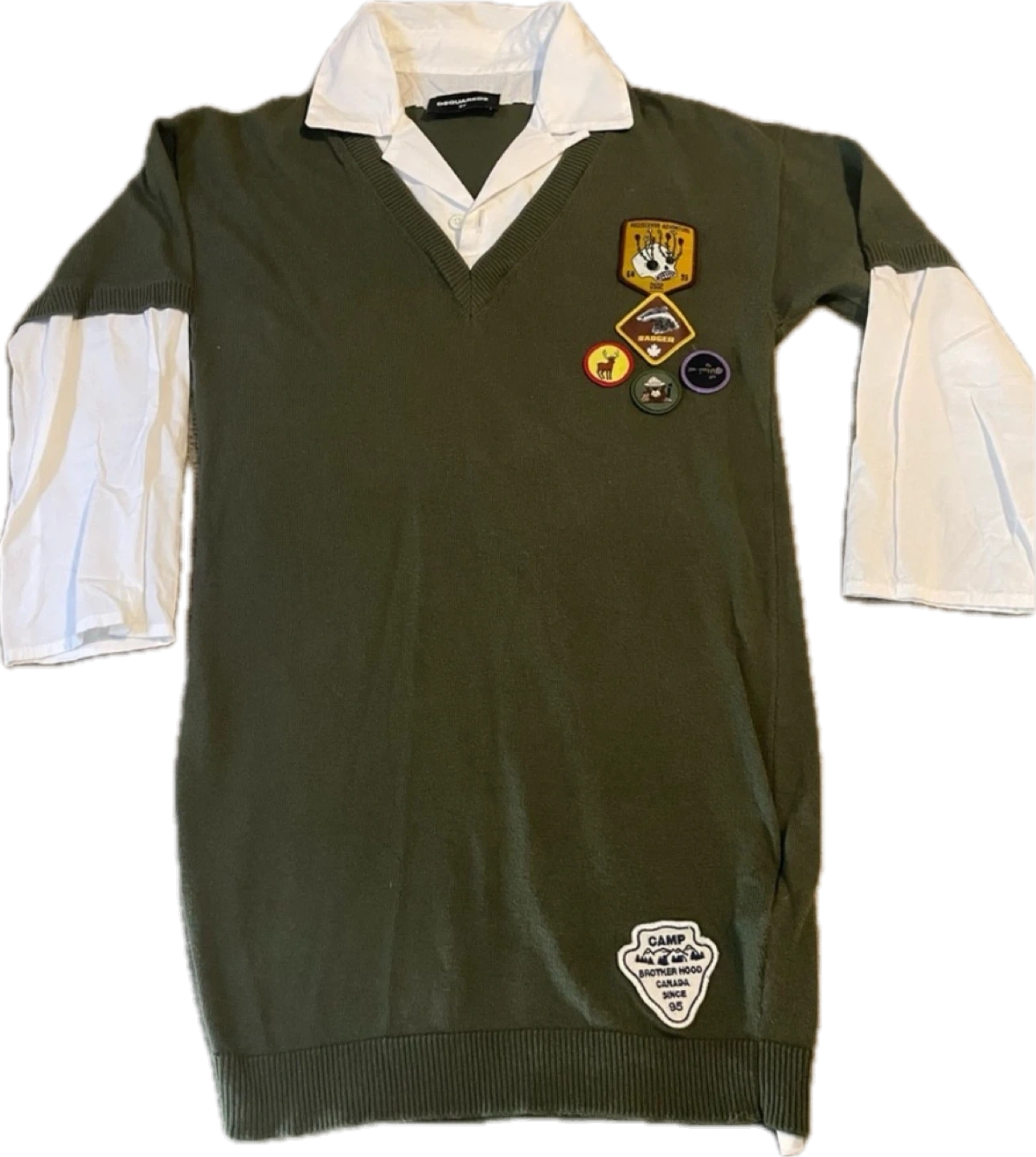 This DSQUARED2 sweater dress features a white collared shirt layered under a dark green v-neck knit. It's adorned with various camp-themed patches, including a badger and a deer. The dress also has white long sleeves. Perfect for casual outings or themed events!